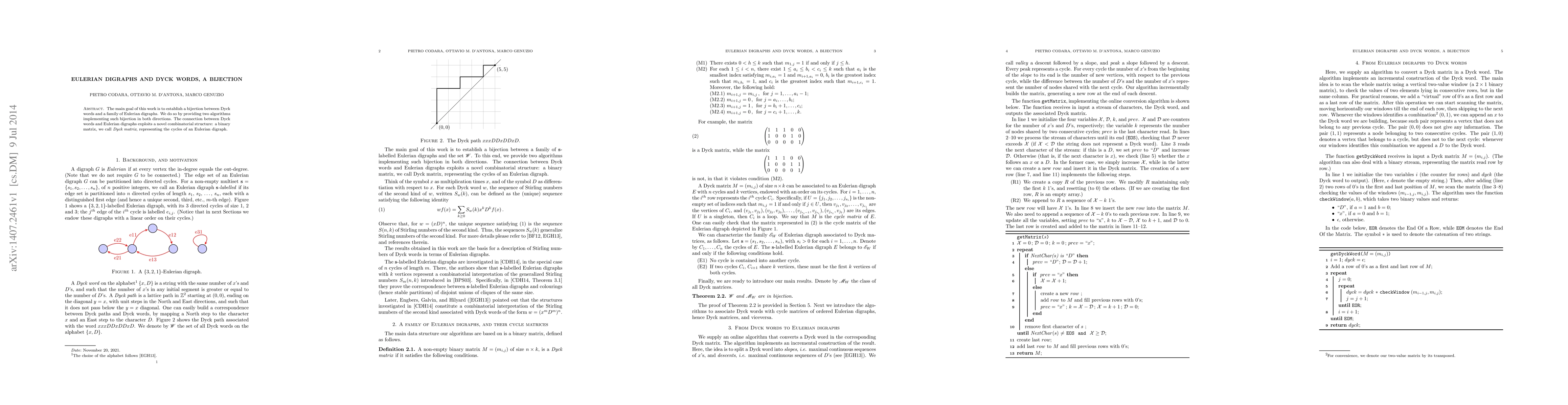 This paper establishes a bijection between Dyck words and a family of Eulerian digraphs using two algorithms. It introduces a novel combinatorial structure, the Dyck matrix, to represent the cycles of an Eulerian digraph, facilitating this connection.