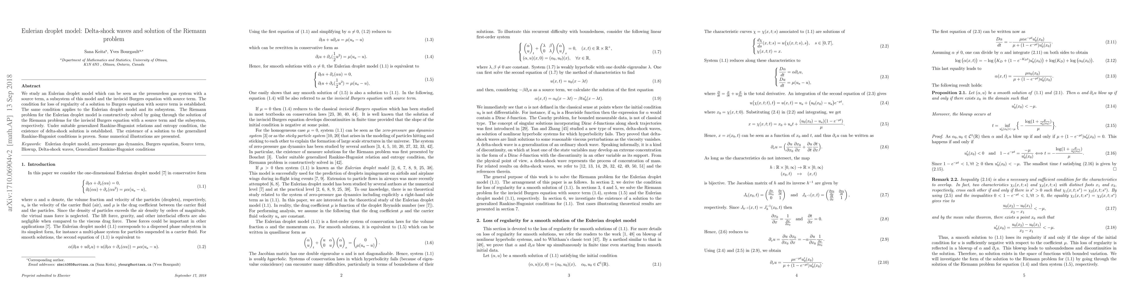 We study an Eulerian droplet model which can be seen as the pressureless gas system with a source term, a subsystem of this model and the inviscid Burgers equation with source term. The condition for loss of regularity of a solution to Burgers equation with source term is established. The same condition applies to the Eulerian droplet model and its subsystem. The Riemann problem for the Eulerian droplet model is constructively solved by going through the solution of the Riemann problems for the inviscid Burgers equation with a source term and the subsystem, respectively. Under suitable generalized Rankine-Hugoniot relations and entropy condition, the existence of delta-shock solution is established. The existence of a solution to the generalized Rankine-Hugoniot conditions is proven. Some numerical illustrations are presented.
