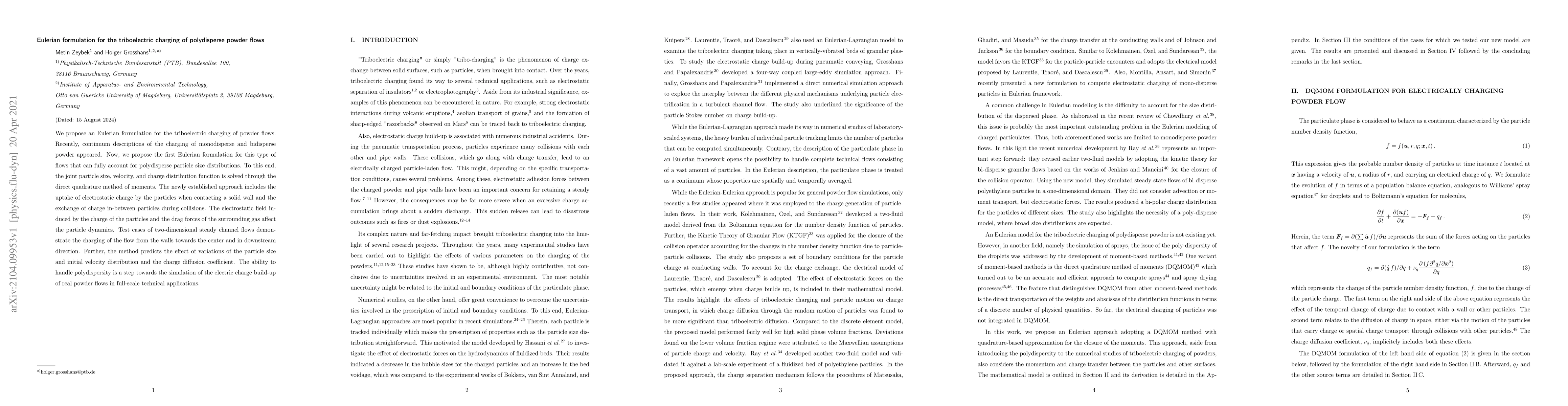 This paper proposes an Eulerian formulation to model triboelectric charging in polydisperse powder flows, accounting for particle size, velocity, and charge distributions. The method predicts electrostatic charge uptake and particle dynamics influenced by the electrostatic field and drag forces.