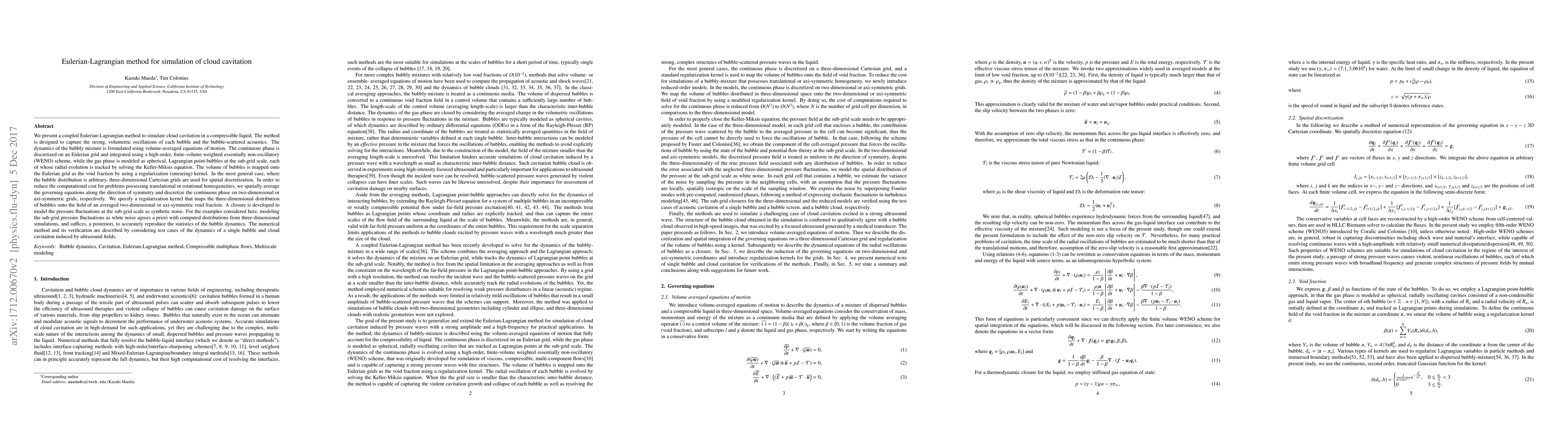 We present a coupled Eulerian-Lagrangian method to simulate cloud cavitation in a compressible liquid. The method is designed to capture the strong, volumetric oscillations of each bubble and the bubble-scattered acoustics. The dynamics of the bubbly mixture is formulated using volume-averaged equations of motion. The continuous phase is discretized on an Eulerian grid and integrated using a high-order, finite-volume weighted essentially non-oscillatory (WENO) scheme, while the gas phase is modeled as spherical, Lagrangian point-bubbles at the sub-grid scale, each of whose radial evolution is tracked by solving the Keller-Miksis equation. The volume of bubbles is mapped onto the Eulerian grid as the void fraction by using a regularization (smearing) kernel. In the most general case, where the bubble distribution is arbitrary, three-dimensional Cartesian grids are used for spatial discretization. In order to reduce the computational cost for problems possessing translational or rotational homogeneities, we spatially average the governing equations along the direction of symmetry and discretize the continuous phase on two-dimensional or axi-symmetric grids, respectively. We specify a regularization kernel that maps the three-dimensional distribution of bubbles onto the field of an averaged two-dimensional or axi-symmetric void fraction. A closure is developed to model the pressure fluctuations at the sub-grid scale as synthetic noise. For the examples considered here, modeling the sub-grid pressure fluctuations as white noise agrees a priori with computed distributions from three-dimensional simulations, and suffices, a posteriori, to accurately reproduce the statistics of the bubble dynamics. The numerical method and its verification are described by considering test cases of the dynamics of a single bubble and cloud cavitaiton induced by ultrasound fields.