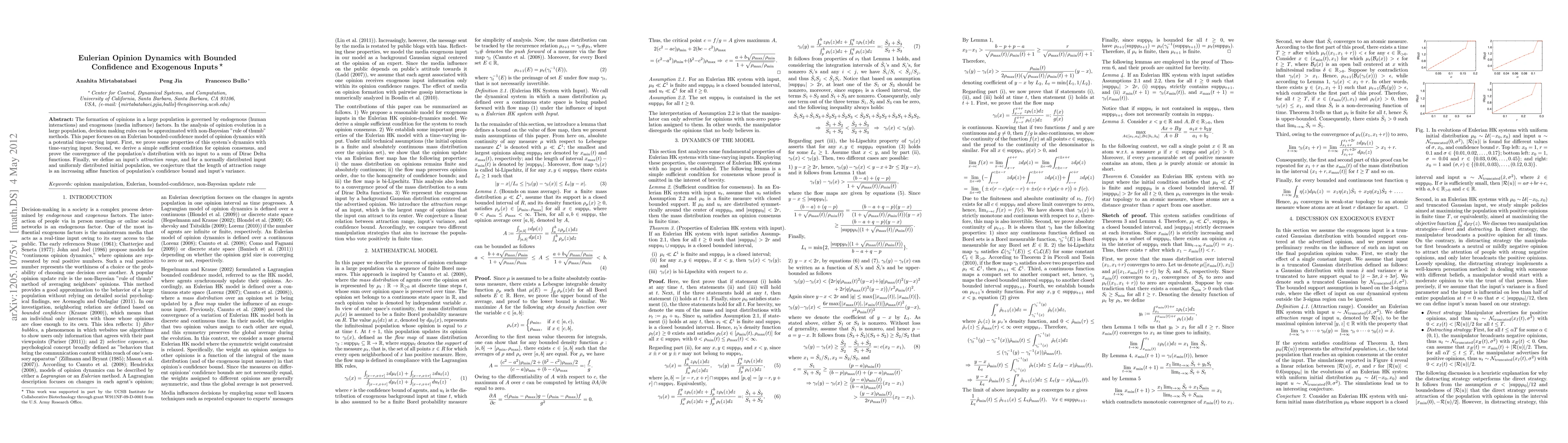 This paper studies an Eulerian opinion dynamics model incorporating bounded confidence and exogenous input, proving its dynamic properties and consensus conditions. It also conjectures that the input's attraction range increases with the confidence bound and input variance for normally distributed inputs.