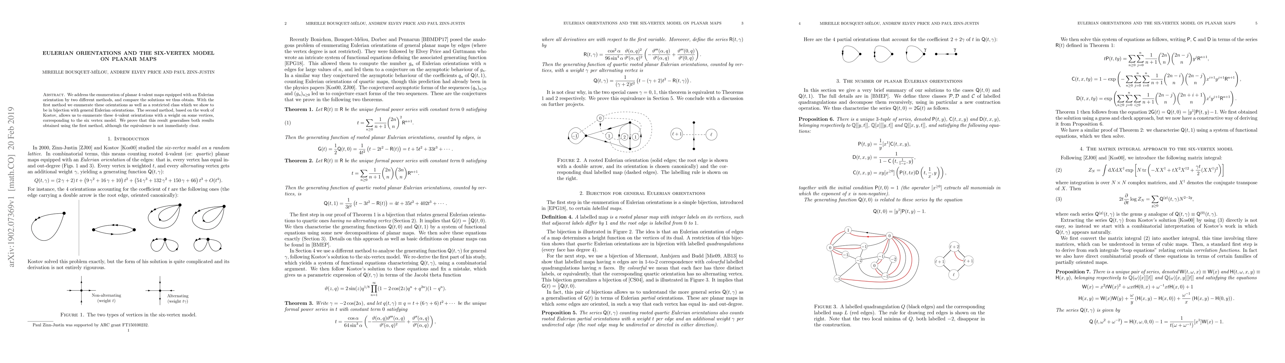 This paper enumerates Eulerian orientations on planar 4-valent maps using two methods: one directly counting orientations and a restricted class, and another based on Kostov's work that incorporates weights corresponding to the six-vertex model, proving its generality over the first method.