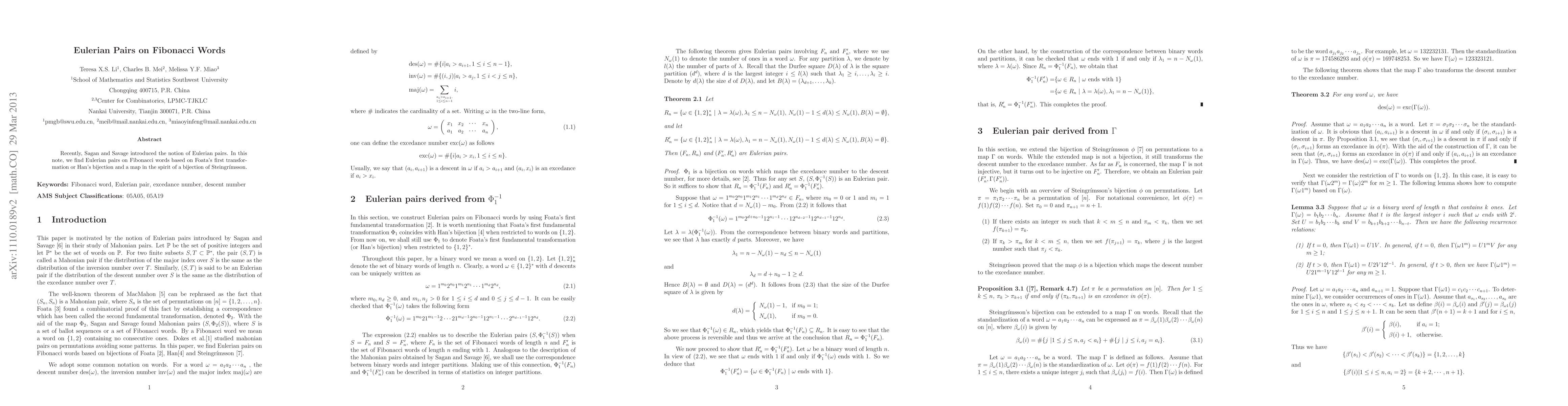 Summary: This paper explores Eulerian pairs within Fibonacci words, utilizing Foata's first transformation, Han's bijection, and a Steingrímsson-inspired map to establish these pairs. The study connects combinatorial structures with these algebraic constructs.