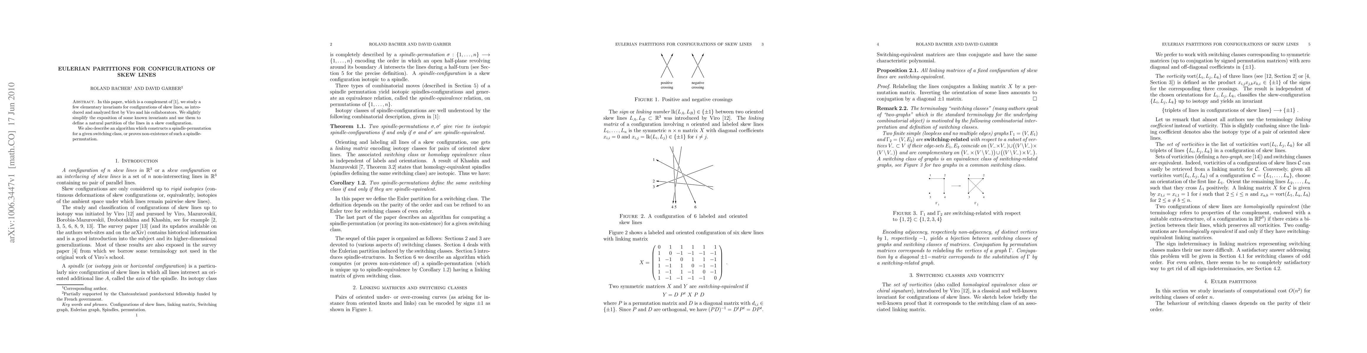 In this paper, which is a complement of \cite{BG}, we study a few elementary invariants for configurations of skew lines, as introduced and analyzed first by Viro and his collaborators. We slightly simplify the exposition of some known invariants and use them to define a natural partition of the lines in a skew configuration. We also describe an algorithm which constructs a spindle-permutation for a given switching class, or proves non-existence of such a spindle-permutation.