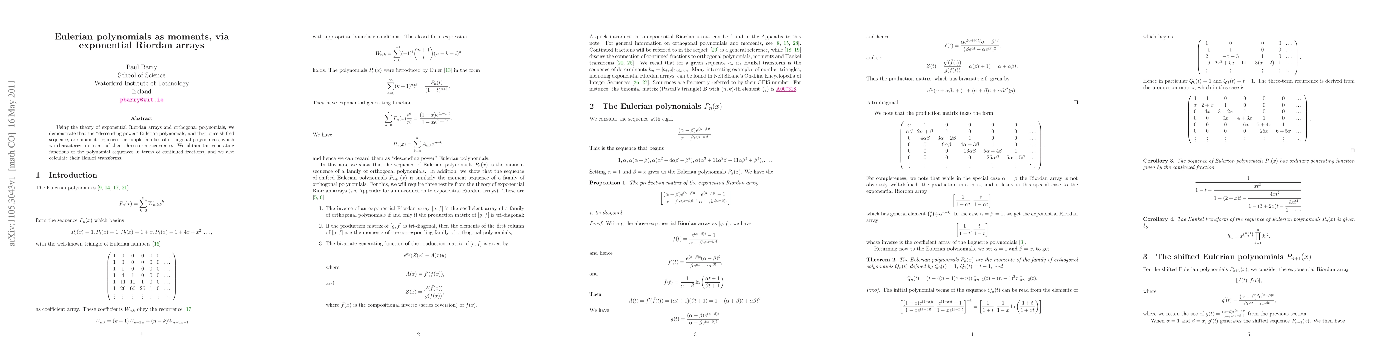 This paper uses exponential Riordan arrays and orthogonal polynomials to show that Eulerian polynomials and their shifted sequences are moment sequences for specific orthogonal polynomial families, characterized by their three-term recurrence. The generating functions of these sequences are derived using continued fractions, and their Hankel transforms are calculated.