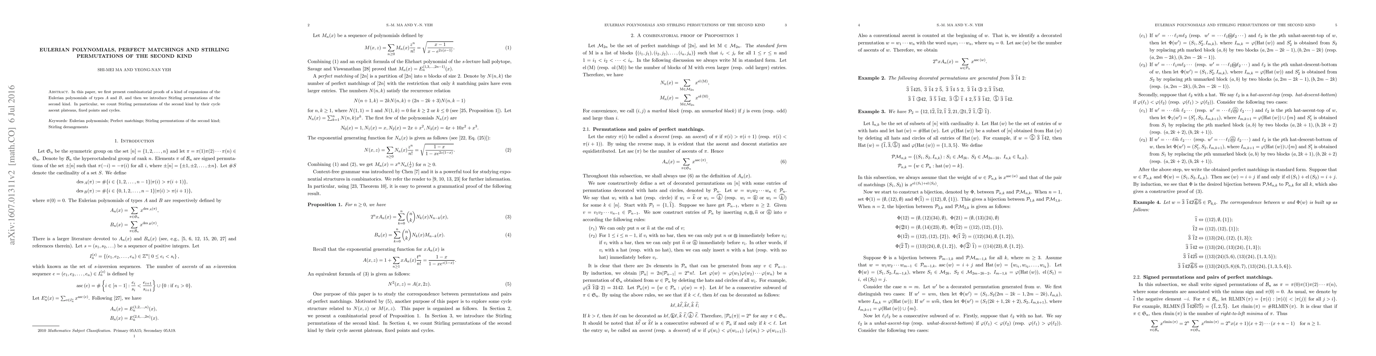 This research paper provides combinatorial proofs for expansions of Eulerian polynomials of types A and B, and introduces Stirling permutations of the second kind, analyzing their properties through cycle ascent plateaus, fixed points, and cycles.