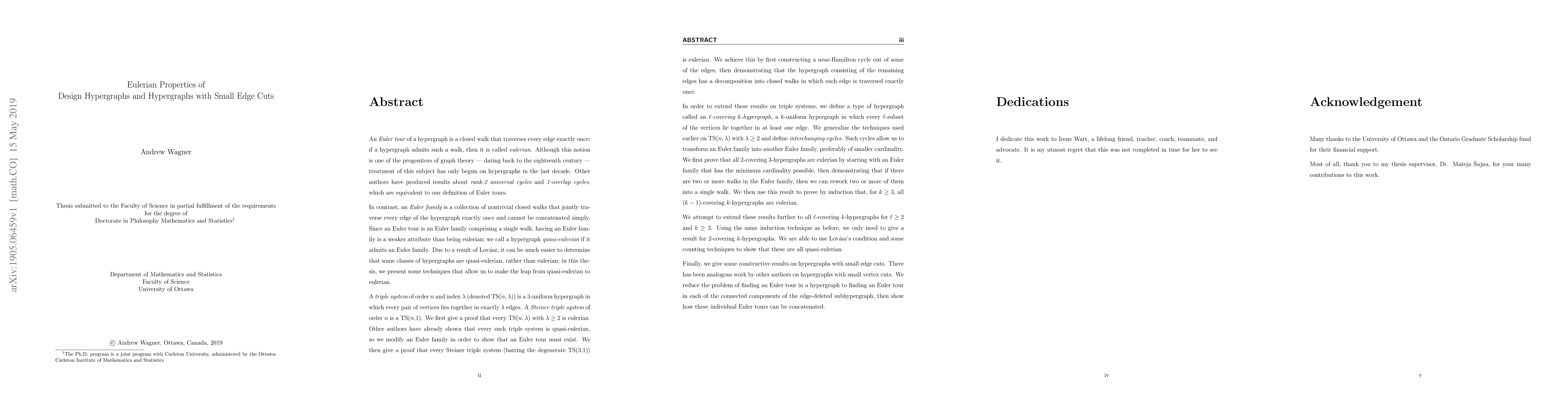This paper explores Eulerian properties in design hypergraphs and hypergraphs with small edge cuts, proving that all triple systems with at least two edges are eulerian. It also introduces $\ell$-covering $k$-hypergraphs, showing they are eulerian when $\ell=k-1$ and quasi-eulerian otherwise, and provides constructive results for hypergraphs with small edge cuts.