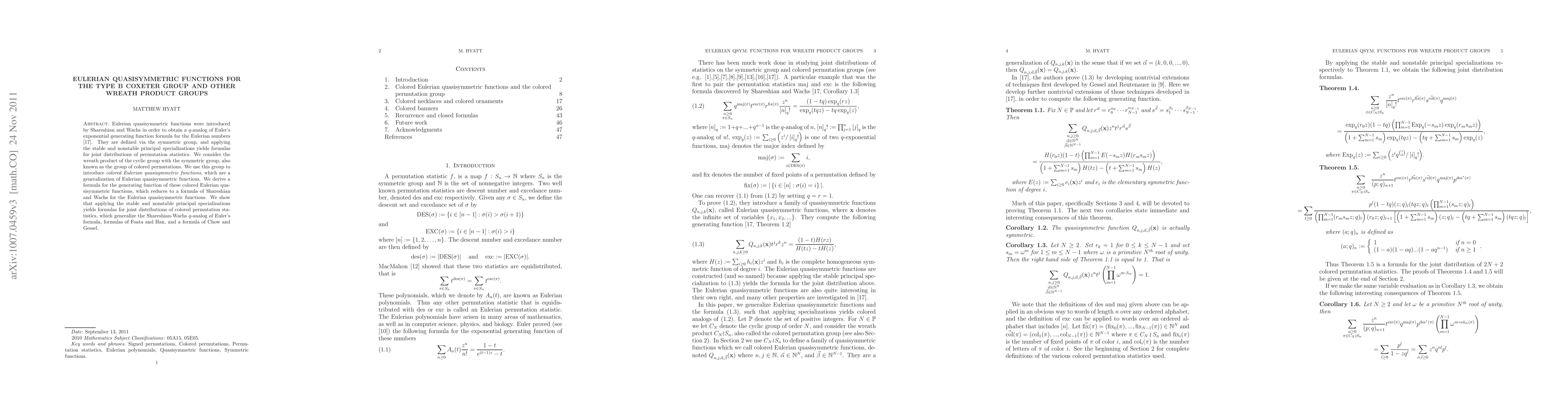 This paper introduces colored Eulerian quasisymmetric functions as a generalization of Eulerian quasisymmetric functions for wreath product groups, specifically the group of colored permutations. It derives a generating function formula for these functions and shows that they generalize existing joint distribution formulas for permutation statistics.