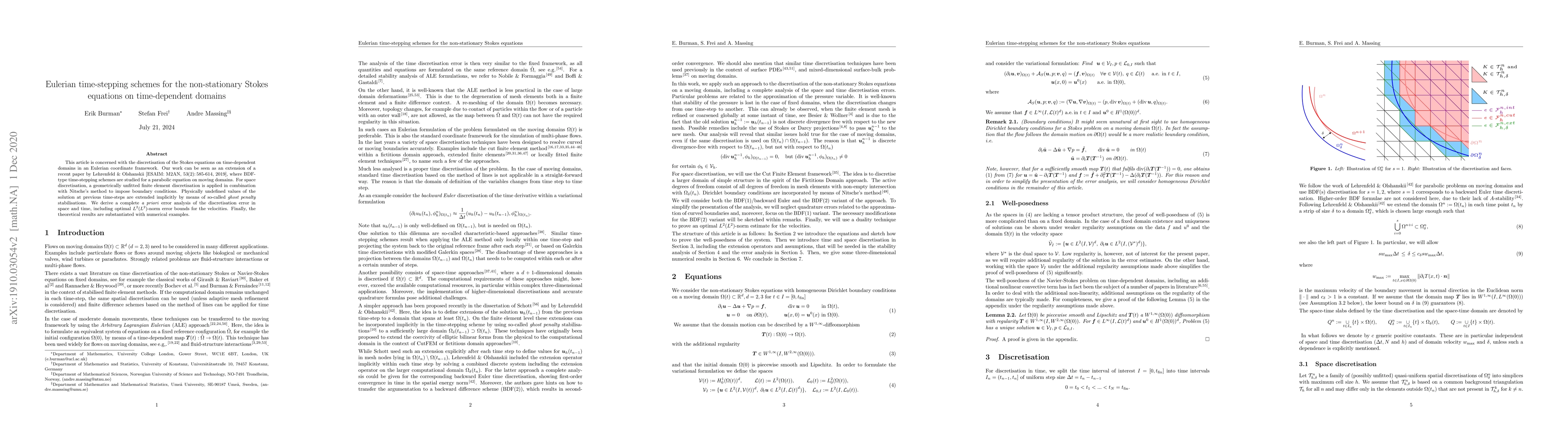 This paper explores Eulerian time-stepping schemes for the non-stationary Stokes equations on time-dependent domains, extending previous work on BDF-type schemes. It employs a geometrically unfitted finite element method with Nitsche's method for boundary conditions and ghost penalty stabilization, providing a complete a priori error analysis and validating results with numerical examples.
