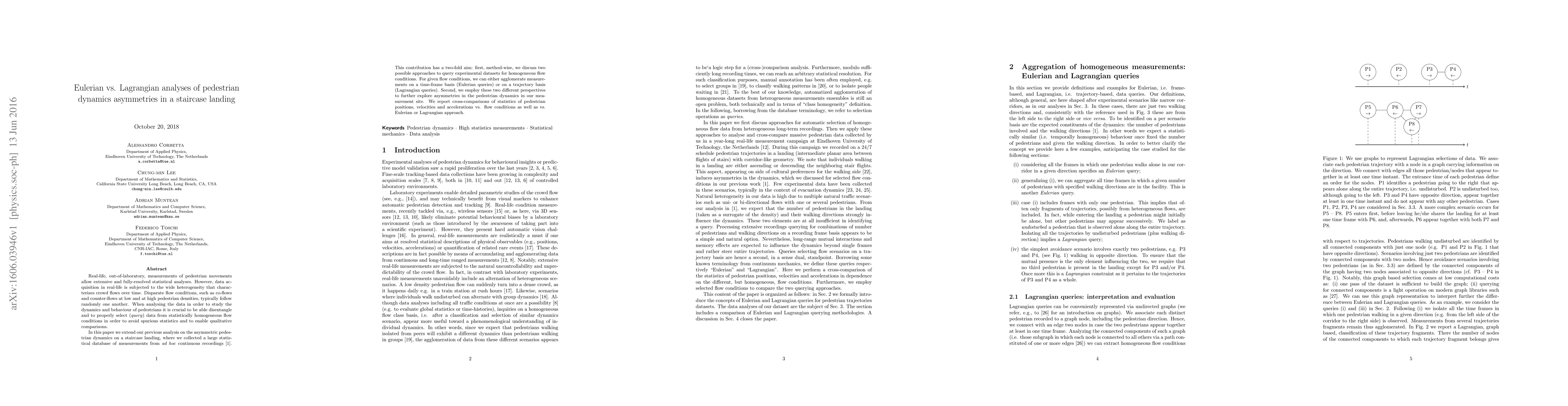 This paper compares Eulerian and Lagrangian methods for analyzing pedestrian dynamics asymmetries in a staircase landing, focusing on how to query experimental datasets for homogeneous flow conditions. It explores statistical differences in pedestrian positions, velocities, and accelerations using both approaches to better understand pedestrian behavior under various flow conditions.