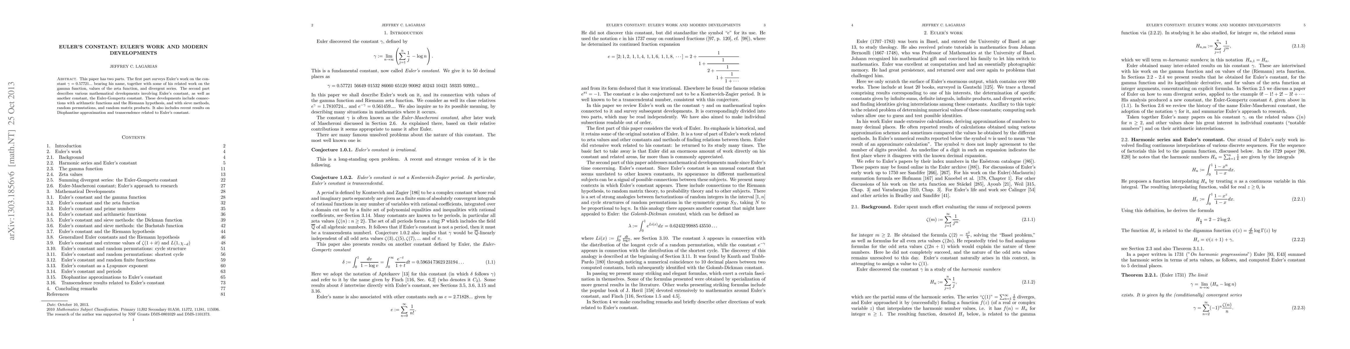 This paper has two parts. The first part surveys Euler's work on the constant gamma=0.57721... bearing his name, together with some of his related work on the gamma function, values of the zeta function and divergent series. The second part describes various mathematical developments involving Euler's constant, as well as another constant, the Euler-Gompertz constant. These developments include connections with arithmetic functions and the Riemann hypothesis, and with sieve methods, random permutations and random matrix products. It includes recent results on Diophantine approximation and transcendence related to Euler's constant.