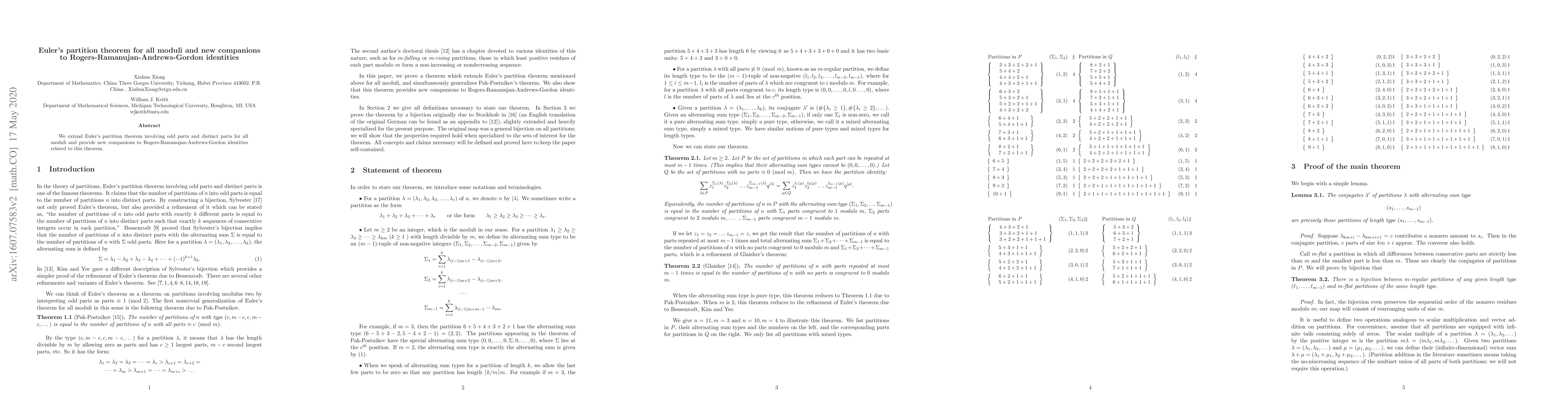 This paper generalizes Euler's partition theorem for all moduli and proves the conjecture for two family partitions. It also introduces $q$-difference equations for related generating functions when the modulus is three and provides new companions to the Rogers-Ramanujan-Andrews-Gordon identities.