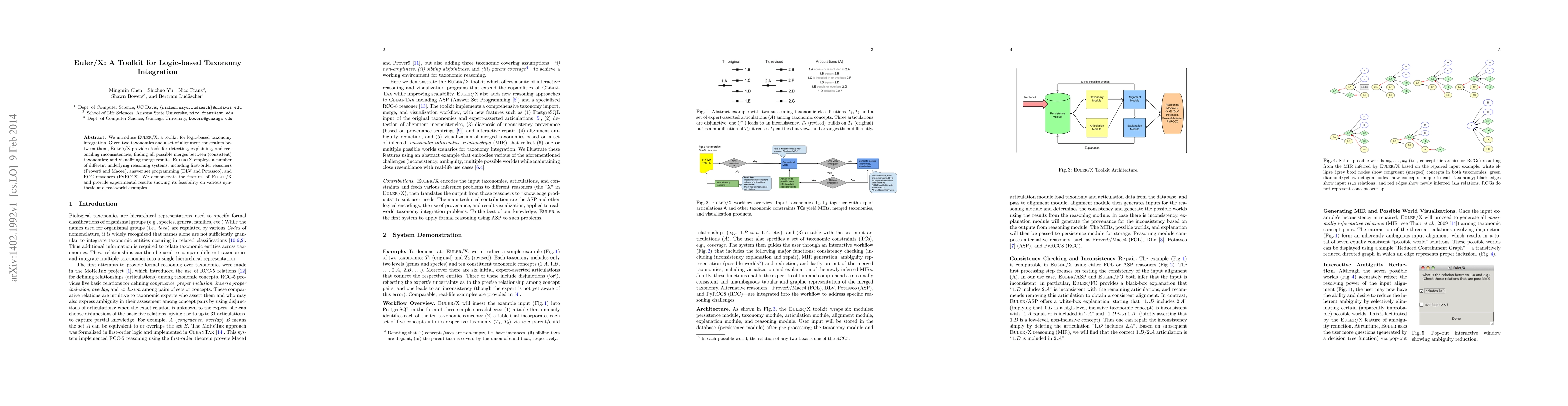 We introduce Euler/X, a toolkit for logic-based taxonomy integration. Given two taxonomies and a set of alignment constraints between them, Euler/X provides tools for detecting, explaining, and reconciling inconsistencies; finding all possible merges between (consistent) taxonomies; and visualizing merge results. Euler/X employs a number of different underlying reasoning systems, including first-order reasoners (Prover9 and Mace4), answer set programming (DLV and Potassco), and RCC reasoners (PyRCC8). We demonstrate the features of Euler/X and provide experimental results showing its feasibility on various synthetic and real-world examples.