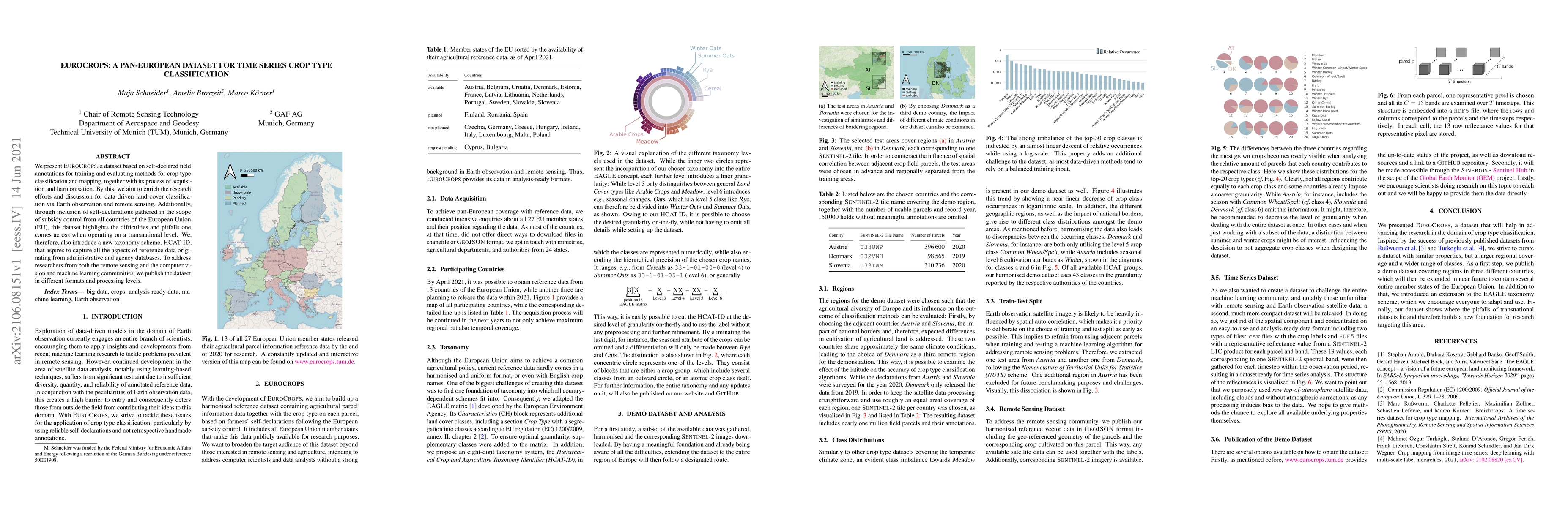 EuroCrops is a pan-European dataset for crop type classification, created from self-declared field annotations and administrative data, aiming to enhance land cover classification research. It includes a new taxonomy scheme, HCAT-ID, to standardize transnational data, and is published in various formats for remote sensing and machine learning applications.