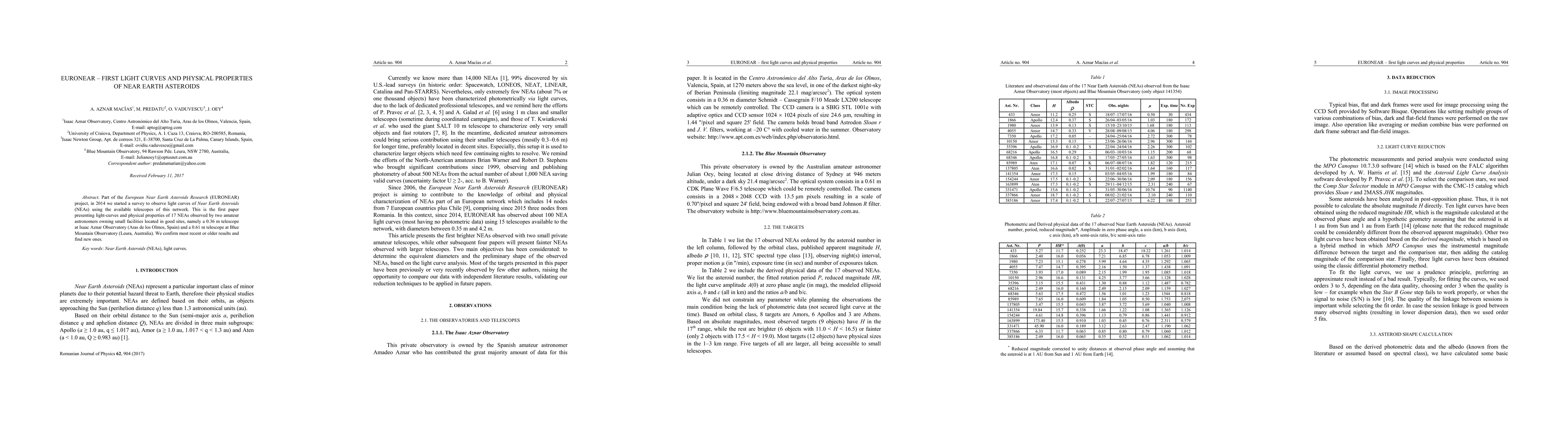 Summary: The EURONEAR project initiated a survey in 2014 to observe light curves of Near Earth Asteroids (NEAs) using amateur telescopes in Spain and Australia. This paper presents the first results, detailing the light curves and physical properties of 17 NEAs, confirming and discovering new findings.