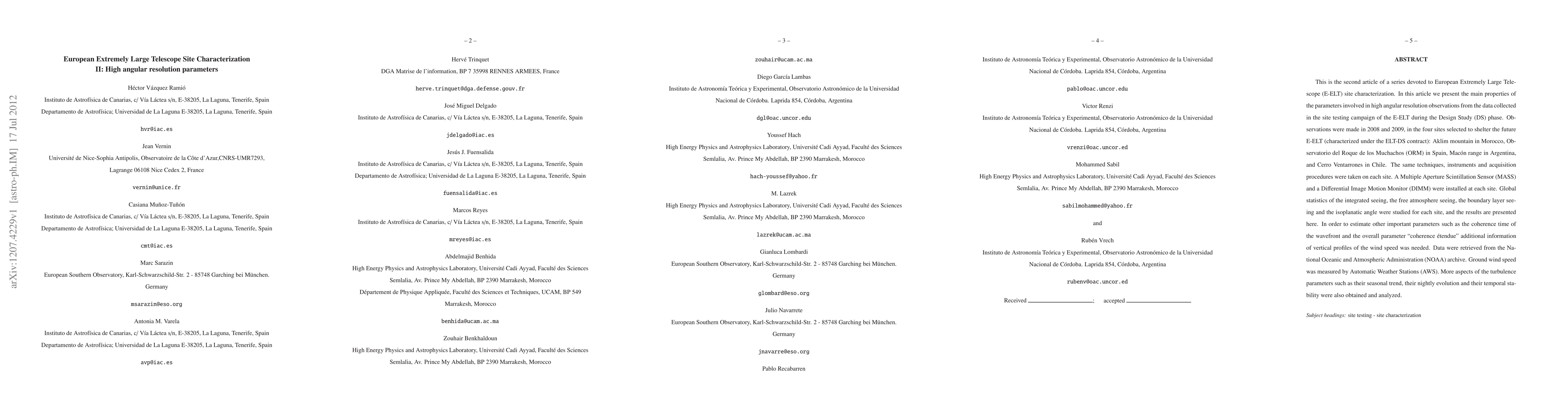 This is the second article of a series devoted to European Extremely Large Telescope (E-ELT) site characterization. In this article we present the main properties of the parameters involved in high angular resolution observations from the data collected in the site testing campaign of the E-ELT during the Design Study (DS) phase. Observations were made in 2008 and 2009, in the four sites selected to shelter the future E-ELT (characterized under the ELT-DS contract): Aklim mountain in Morocco, Observatorio del Roque de los Muchachos (ORM) in Spain, Mac\'on range in Argentina, and Cerro Ventarrones in Chile. The same techniques, instruments and acquisition procedures were taken on each site. A Multiple Aperture Scintillation Sensor (MASS) and a Differential Image Motion Monitor (DIMM) were installed at each site. Global statistics of the integrated seeing, the free atmosphere seeing, the boundary layer seeing and the isoplanatic angle were studied for each site, and the results are presented here. In order to estimate other important parameters such as the coherence time of the wavefront and the overall parameter "coherence \'etendue" additional information of vertical profiles of the wind speed was needed. Data were retrieved from the National Oceanic and Atmospheric Administration (NOAA) archive. Ground wind speed was measured by Automatic Weather Stations (AWS). More aspects of the turbulence parameters such as their seasonal trend, their nightly evolution and their temporal stability were also obtained and analyzed.