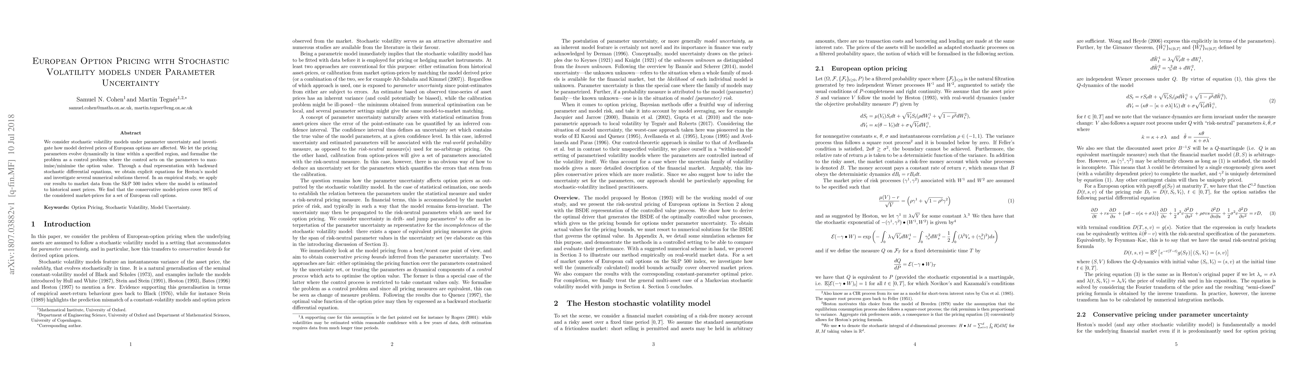 This paper explores the pricing of European options under stochastic volatility models with parameter uncertainty, framing the problem as a dynamic control issue. It employs dual representation and backward stochastic differential equations to derive explicit pricing equations for Heston's model, and finds that conservative model prices cover 98% of market prices for European call options in an empirical study on S&P 500 data.