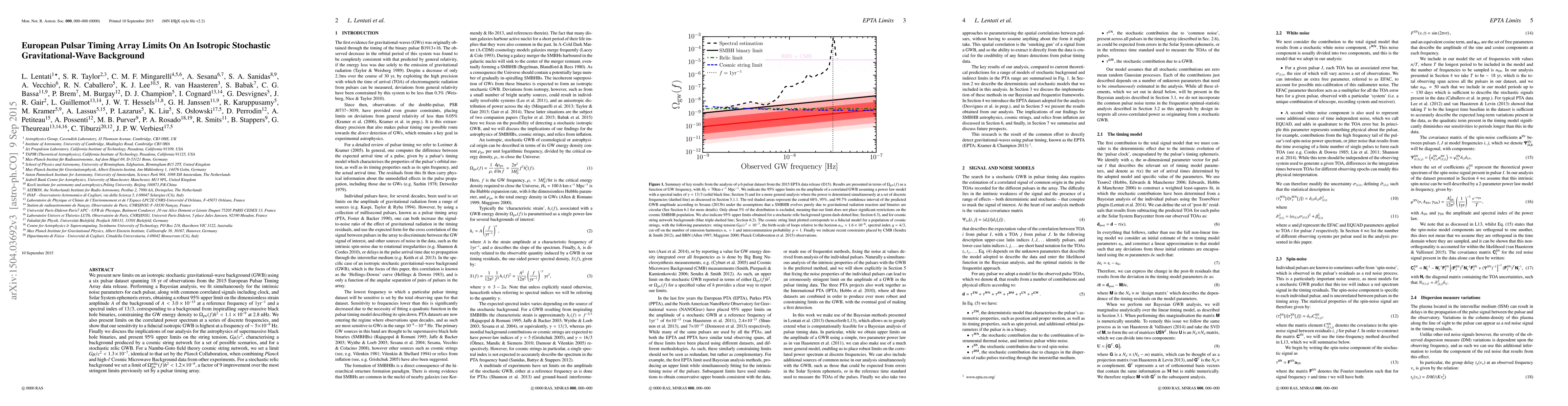 We present new limits on an isotropic stochastic gravitational-wave background (GWB) using a six pulsar dataset spanning 18 yr of observations from the 2015 European Pulsar Timing Array data release. Performing a Bayesian analysis, we fit simultaneously for the intrinsic noise parameters for each pulsar, along with common correlated signals including clock, and Solar System ephemeris errors, obtaining a robust 95$\%$ upper limit on the dimensionless strain amplitude $A$ of the background of $A<3.0\times 10^{-15}$ at a reference frequency of $1\mathrm{yr^{-1}}$ and a spectral index of $13/3$, corresponding to a background from inspiralling super-massive black hole binaries, constraining the GW energy density to $\Omega_\mathrm{gw}(f)h^2 < 1.1\times10^{-9}$ at 2.8 nHz. We also present limits on the correlated power spectrum at a series of discrete frequencies, and show that our sensitivity to a fiducial isotropic GWB is highest at a frequency of $\sim 5\times10^{-9}$~Hz. Finally we discuss the implications of our analysis for the astrophysics of supermassive black hole binaries, and present 95$\%$ upper limits on the string tension, $G\mu/c^2$, characterising a background produced by a cosmic string network for a set of possible scenarios, and for a stochastic relic GWB. For a Nambu-Goto field theory cosmic string network, we set a limit $G\mu/c^2<1.3\times10^{-7}$, identical to that set by the {\it Planck} Collaboration, when combining {\it Planck} and high-$\ell$ Cosmic Microwave Background data from other experiments. For a stochastic relic background we set a limit of $\Omega^\mathrm{relic}_\mathrm{gw}(f)h^2<1.2 \times10^{-9}$, a factor of 9 improvement over the most stringent limits previously set by a pulsar timing array.