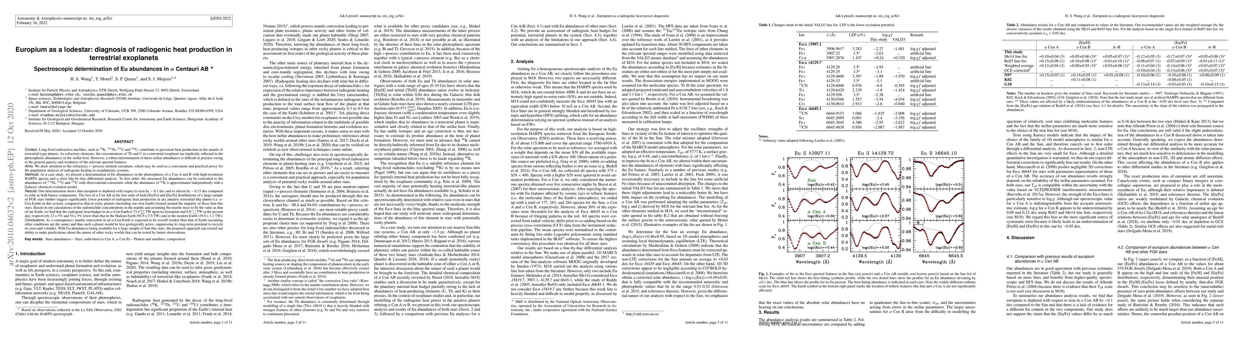 Long-lived radioactive nuclides, such as $^{40}$K, $^{232}$Th, $^{235}$U and $^{238}$U, contribute to persistent heat production in the mantle of terrestrial-type planets. As refractory elements, the concentrations of Th and U in a terrestrial exoplanet are implicitly reflected in the photospheric abundances in the stellar host. However, a robust determination of these stellar abundances is difficult in practice owing to the general paucity and weakness of the relevant spectral features. We draw attention to the refractory, $r-$process element europium, which may be used as a convenient and practical proxy for the population analysis of radiogenic heating in exoplanetary systems. As a case study, we present a determination of Eu abundances in the photospheres of $\alpha$ Cen A and B. We find that europium is depleted with respect to iron by $\sim$ 0.1 dex and to silicon by $\sim$ 0.15 dex compared to solar in both binary components. To first order, the measured Eu abundances can be converted to the abundances of $^{232}$Th, $^{235}$U and $^{238}$U with observational constraints while the abundance of $^{40}$K is approximated independently with a Galactic chemical evolution model. We find that the radiogenic heat budget in an $\alpha$-Cen-Earth is $73.4^{+8.3}_{-6.9}$ TW upon its formation and $8.8^{+1.7}_{-1.3}$ TW at the present day, respectively $23\pm5$ % and $54\pm5$ % lower than that in the Hadean and modern Earth. As a consequence, mantle convection in an $\alpha$-Cen-Earth is expected to be overall weaker than that of the Earth (assuming other conditions are the same) and thus such a planet would be less geologically active, suppressing its long-term potential to recycle its crust and volatiles. With Eu abundances being available for a large sample of Sun-like stars, the proposed approach can extend our ability to make predictions about the nature of other rocky worlds.