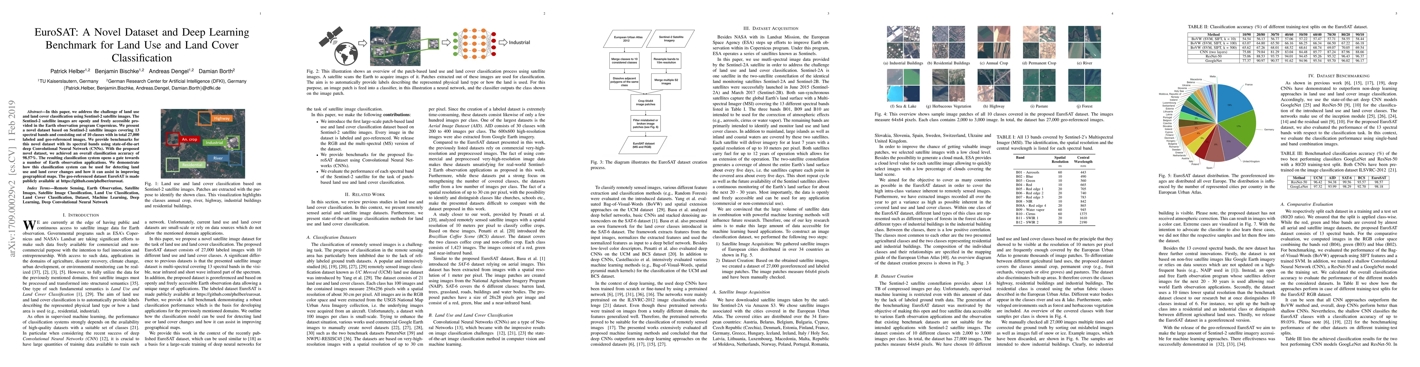 This paper introduces EuroSAT, a new dataset for land use and land cover classification using Sentinel-2 satellite images, achieving 98.57% accuracy with deep CNNs. The dataset, consisting of 27,000 labeled images, is publicly available to facilitate Earth observation applications.