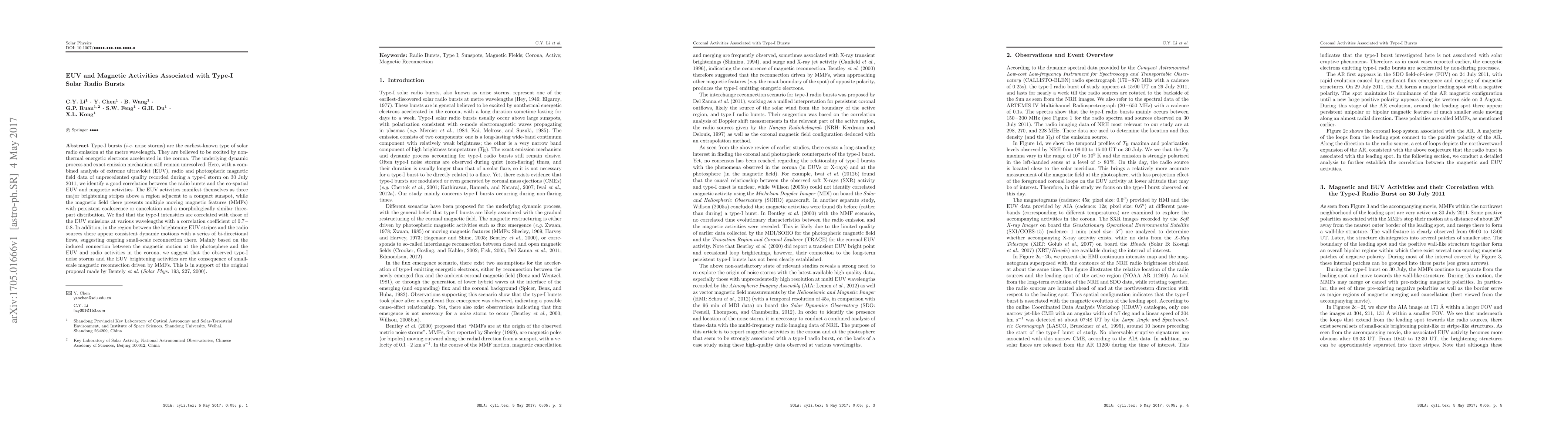 The study analyzes a Type-I solar radio burst event on July 30, 2011, finding a strong correlation between the burst's radio emissions and co-spatial extreme ultraviolet (EUV) and magnetic activities. The researchers observed three major EUV brightening stripes and multiple moving magnetic features (MMFs) with consistent small-scale reconnection activities between them. This supports the theory that Type-I noise storms and associated EUV brightening are caused by magnetic reconnection driven by MMFs.