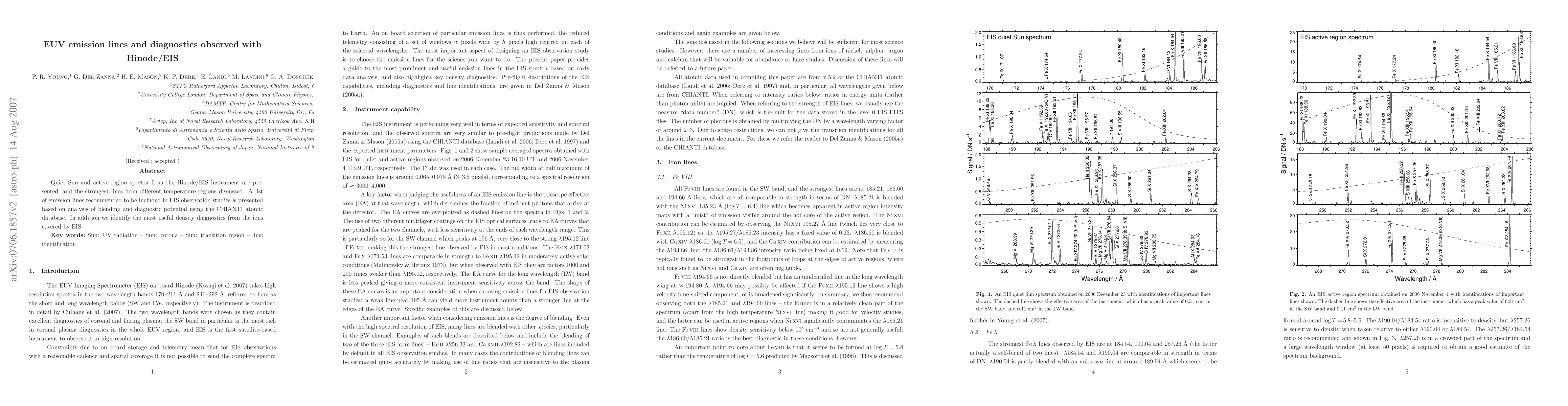 This paper analyzes quiet Sun and active region spectra from the Hinode/EIS instrument, recommending key EUV emission lines for future studies based on their diagnostic potential and blending analysis. It also identifies the most useful density diagnostics among the ions observed by EIS.
