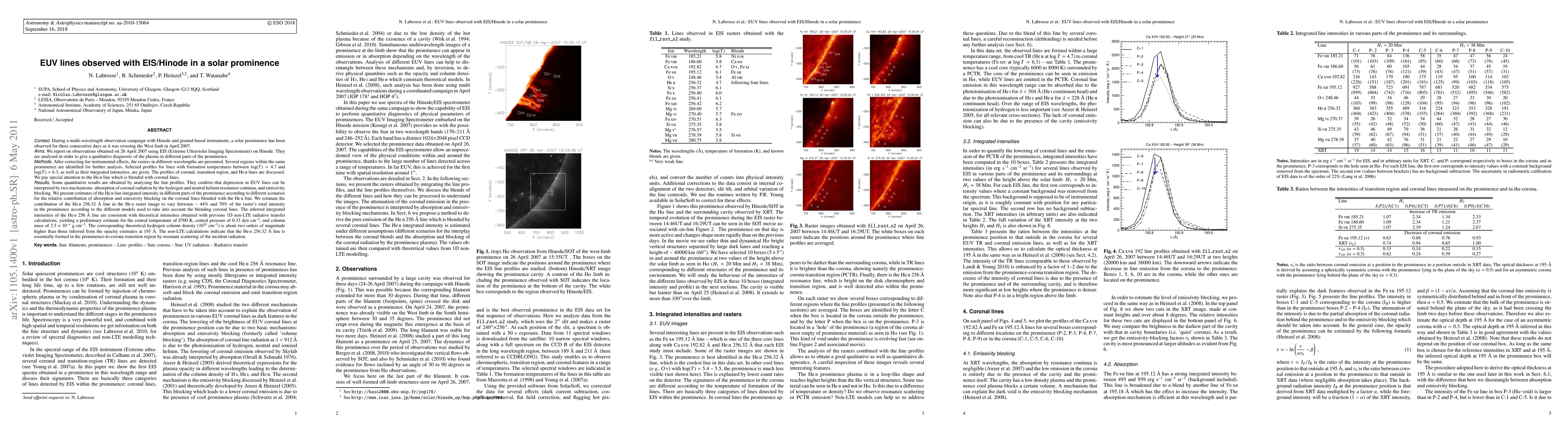 Researchers observed EUV lines in a solar prominence using Hinode's EIS, finding that they can be explained by two mechanisms: absorption of coronal radiation and emissivity blocking. The study provides estimates of the He II line intensity and temperature of the prominence.