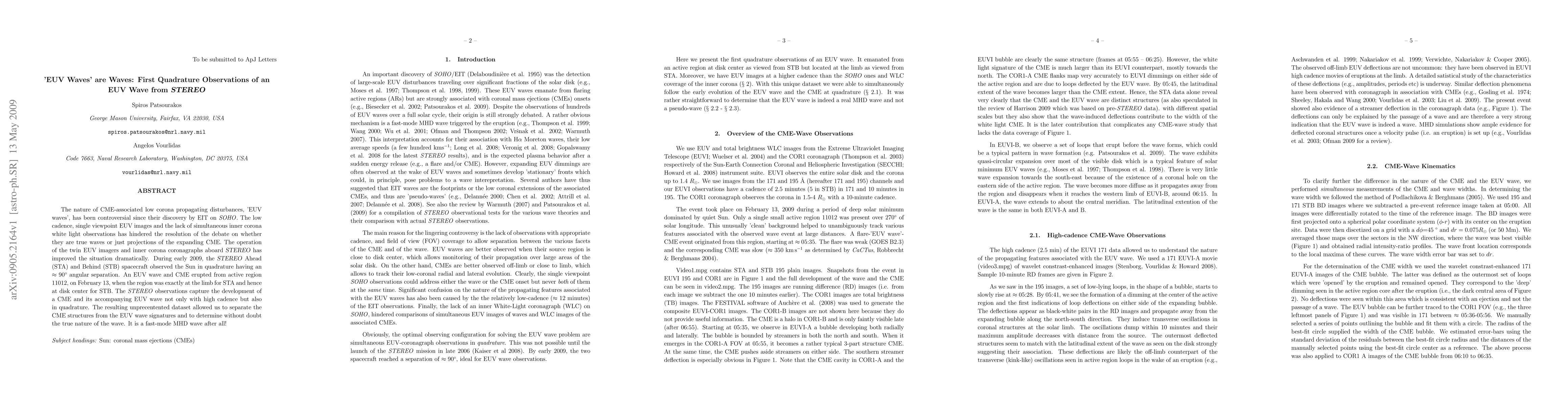 The STEREO mission provided unprecedented quadrature observations of an EUV wave, confirming it as a fast-mode magnetohydrodynamic wave rather than a projection of a CME. This high-cadence, dual-view dataset allowed for the definitive separation of CME structures from EUV wave signatures.