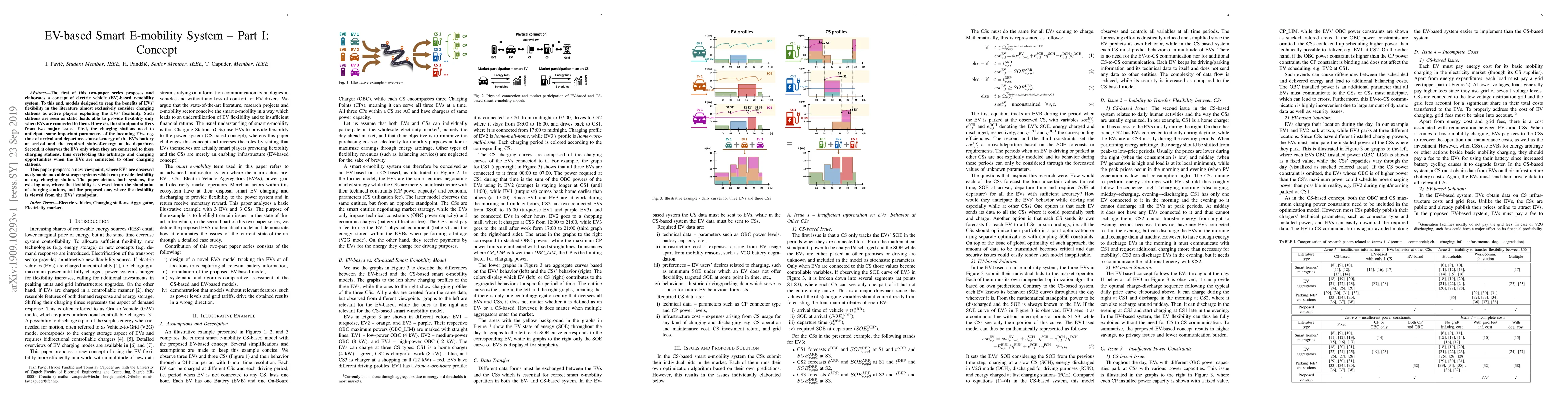 The first of this two-paper series proposes and elaborates a concept of electric vehicle (EV)-based e-mobility system. To this end, models designed to reap the benefits of EVs' flexibility in the literature almost exclusively consider charging stations as active players exploiting the EVs' flexibility. Such stations are seen as static loads able to provide flexibility only when EVs are connected to them. However, this standpoint suffers from two major issues. First, the charging stations need to anticipate some important parameters of the incoming EVs, e.g. time of arrival and departure, state-of-energy of the EV's battery at arrival and the required state-of-energy at its departure. Second, it observes the EVs only when they are connected to these charging stations, thus overlooking the arbitrage and charging opportunities when the EVs are connected to other charging stations. This paper proposes a new viewpoint, where EVs are observed as dynamic movable storage systems which can provide flexibility at any charging station. The paper defines both systems, the existing one, where the flexibility is viewed from the standpoint of charging stations, and the proposed one, where the flexibility is viewed from the EVs' standpoint.