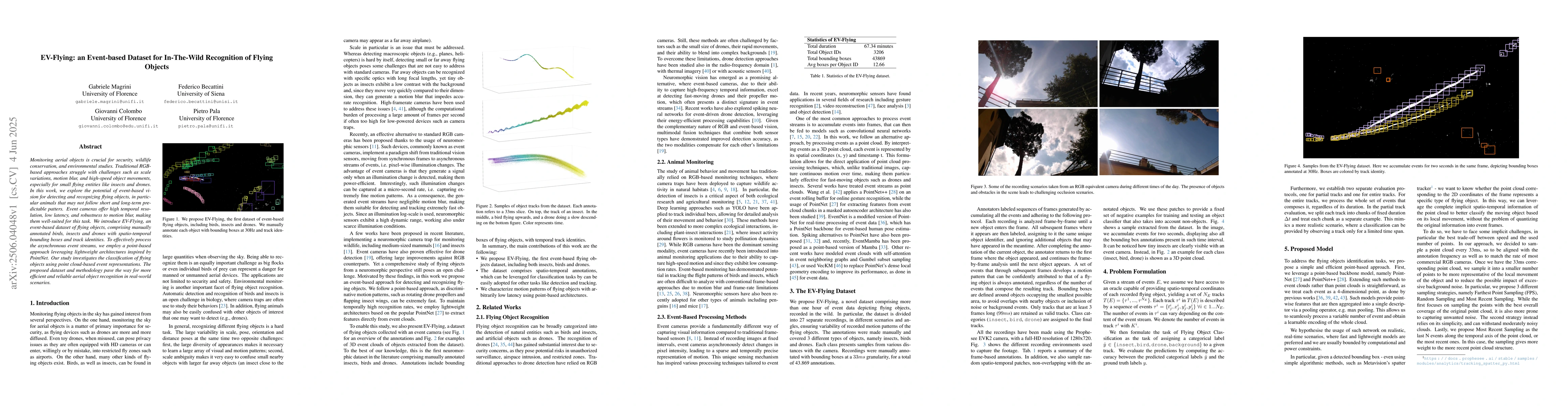 Monitoring aerial objects is crucial for security, wildlife conservation, and environmental studies. Traditional RGB-based approaches struggle with challenges such as scale variations, motion blur, and high-speed object movements, especially for small flying entities like insects and drones. In this work, we explore the potential of event-based vision for detecting and recognizing flying objects, in particular animals that may not follow short and long-term predictable patters. Event cameras offer high temporal resolution, low latency, and robustness to motion blur, making them well-suited for this task. We introduce EV-Flying, an event-based dataset of flying objects, comprising manually annotated birds, insects and drones with spatio-temporal bounding boxes and track identities. To effectively process the asynchronous event streams, we employ a point-based approach leveraging lightweight architectures inspired by PointNet. Our study investigates the classification of flying objects using point cloud-based event representations. The proposed dataset and methodology pave the way for more efficient and reliable aerial object recognition in real-world scenarios.