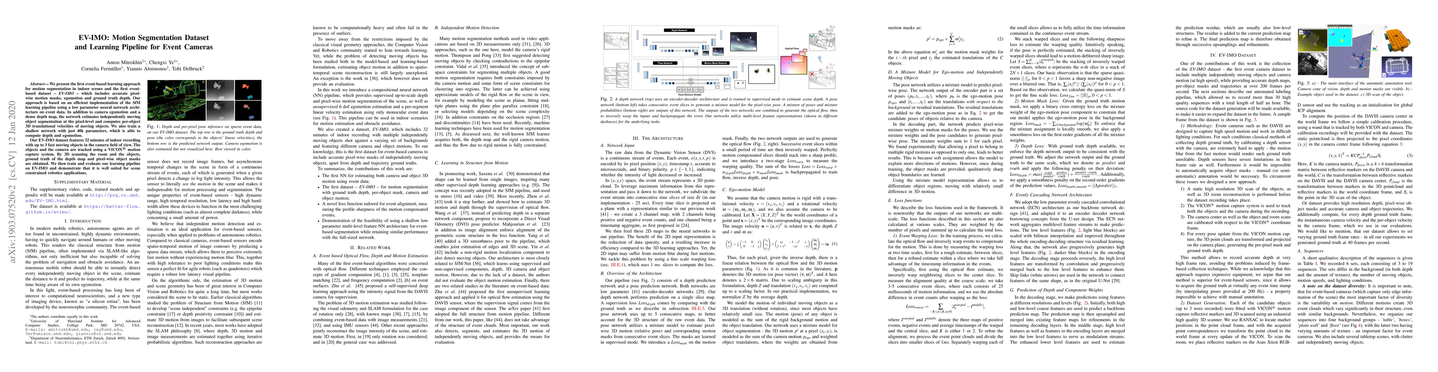 We present the first event-based learning approach for motion segmentation in indoor scenes and the first event-based dataset - EV-IMO - which includes accurate pixel-wise motion masks, egomotion and ground truth depth. Our approach is based on an efficient implementation of the SfM learning pipeline using a low parameter neural network architecture on event data. In addition to camera egomotion and a dense depth map, the network estimates pixel-wise independently moving object segmentation and computes per-object 3D translational velocities for moving objects. We also train a shallow network with just 40k parameters, which is able to compute depth and egomotion. Our EV-IMO dataset features 32 minutes of indoor recording with up to 3 fast moving objects simultaneously in the camera field of view. The objects and the camera are tracked by the VICON motion capture system. By 3D scanning the room and the objects, accurate depth map ground truth and pixel-wise object masks are obtained, which are reliable even in poor lighting conditions and during fast motion. We then train and evaluate our learning pipeline on EV-IMO and demonstrate that our approach far surpasses its rivals and is well suited for scene constrained robotics applications.