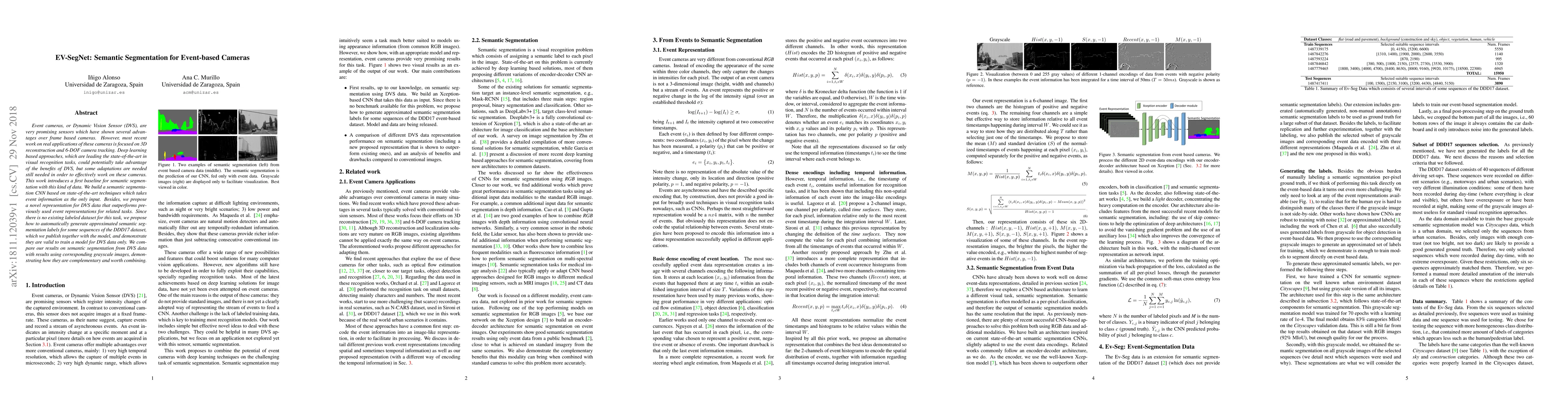 EV-SegNet introduces a deep learning approach for semantic segmentation using event cameras, proposing a novel representation for event data and generating labeled datasets to train the model. The results show that event camera data can complement grayscale images, enhancing visual recognition tasks.