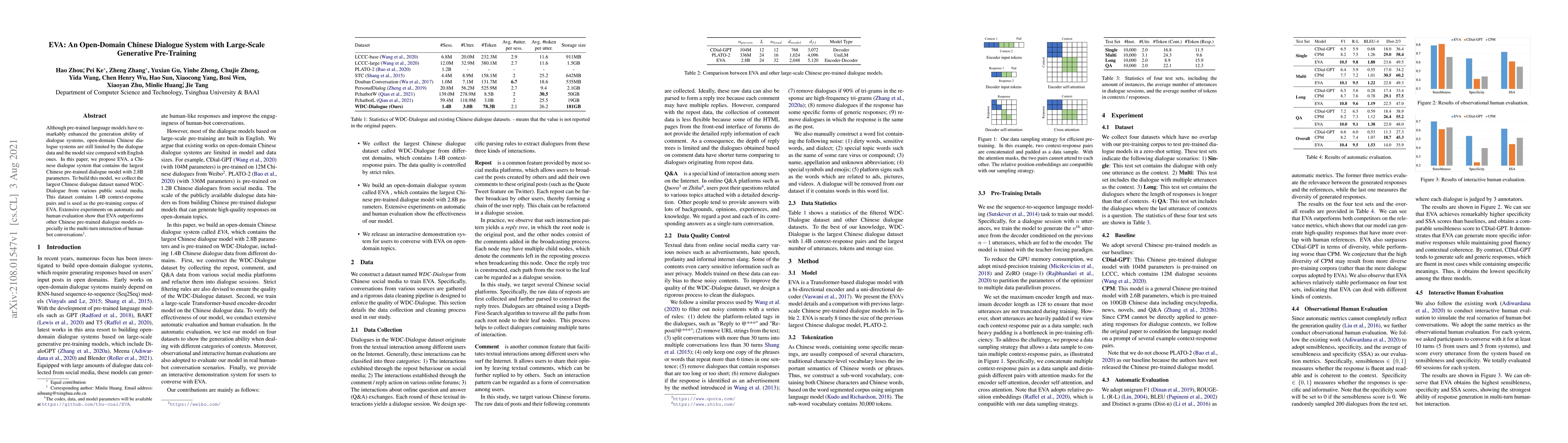 EVA is a large-scale pre-trained Chinese dialogue system with a 2.8B parameter model, developed using the extensive WDC-Dialogue dataset of 1.4B context-response pairs. EVA significantly outperforms other Chinese dialogue models in multi-turn human-bot interactions, as shown by both automatic and human evaluations.