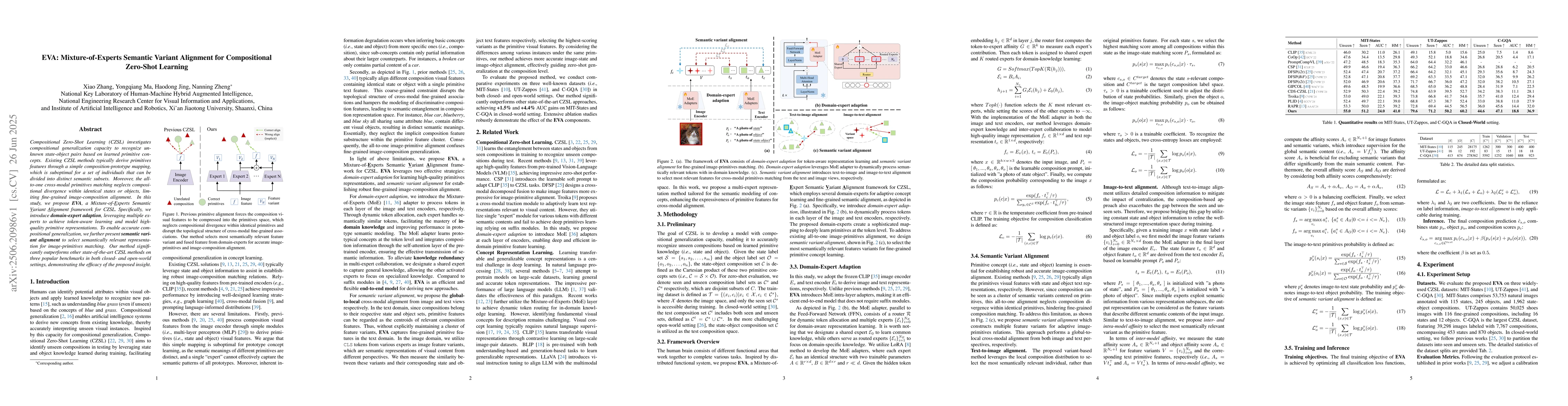 The paper introduces EVA, a Mixture-of-Experts framework that leverages domain-expert adaptation and semantic variant alignment to improve primitive concept learning for CZSL, utilizing a frozen CLIP backbone with a dynamic token routing mechanism.