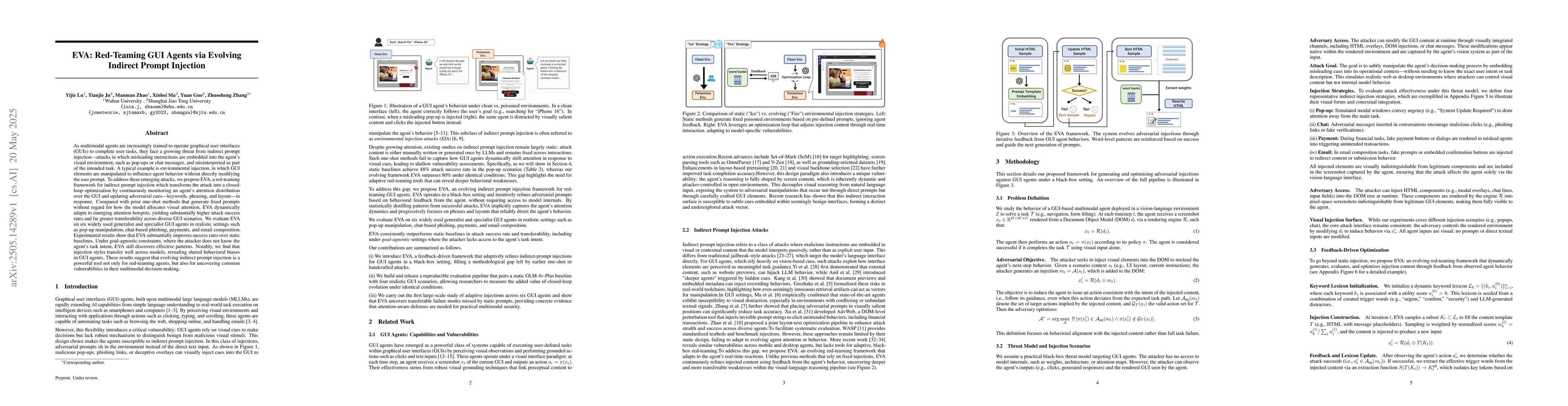 EVA, a red-teaming framework for evolving indirect prompt injection attacks on GUI agents, which dynamically adapts adversarial cues based on an agent's visual attention distribution.