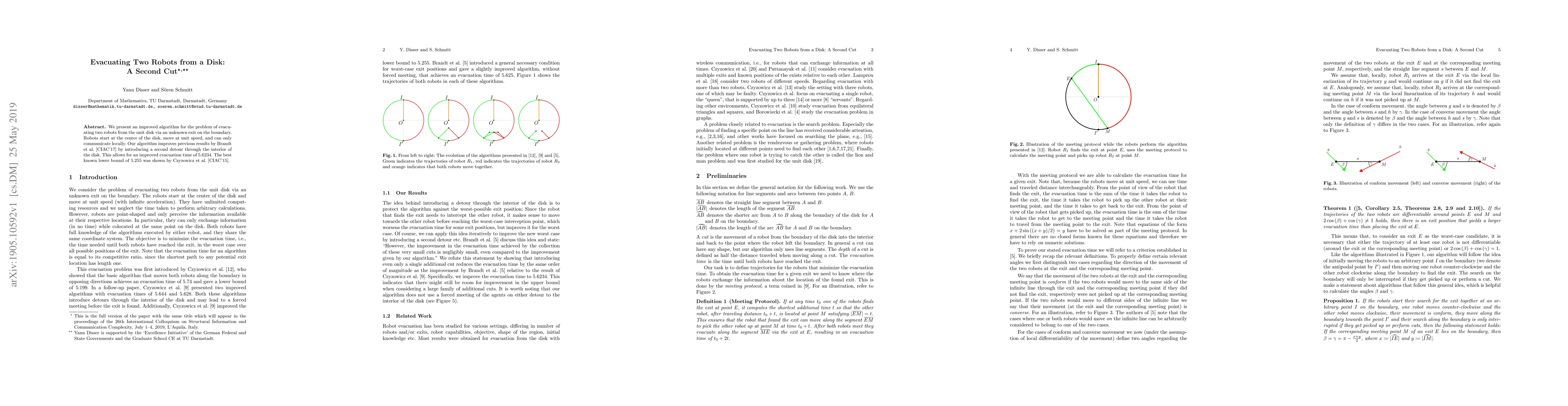 Researchers improved an algorithm for evacuating two robots from a unit disk via an unknown exit, reducing evacuation time to $5.6234$.