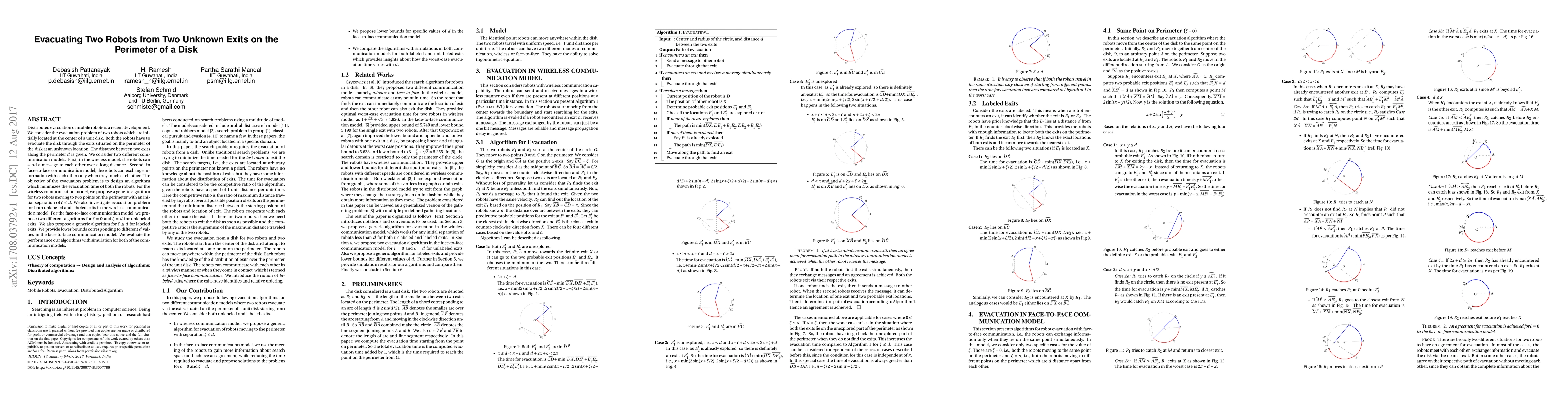 This paper proposes algorithms for evacuating two robots from a disk with unknown exits, considering two communication models: wireless and face-to-face. It develops specific strategies for different initial separations and exit labelings, evaluates the performance through simulations, and provides lower bounds for evacuation times.