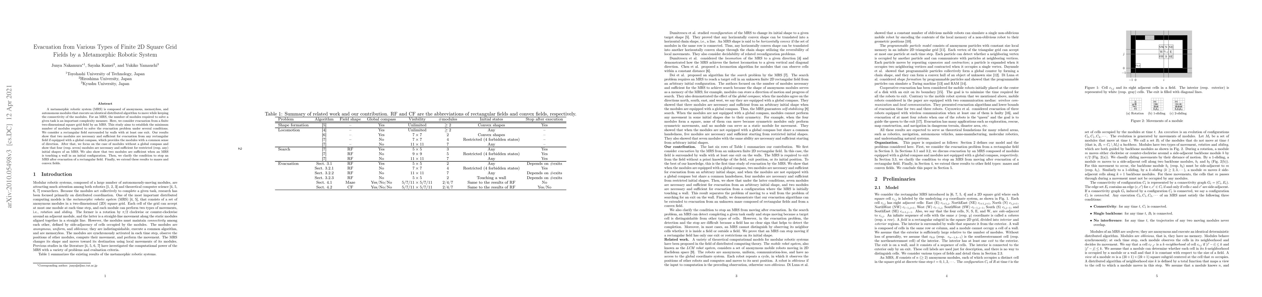 This research investigates the minimum number of modules needed for a metamorphic robotic system (MRS) to evacuate from different 2D grid fields, including rectangular fields with walls and exits, mazes, and convex fields. Key findings include that 2 modules with a global compass are sufficient for any rectangular field, while 4 or 7 modules without a compass are needed for restricted or any initial shapes, respectively. The study also clarifies stopping conditions post-evacuation and extends results to mazes and convex fields.