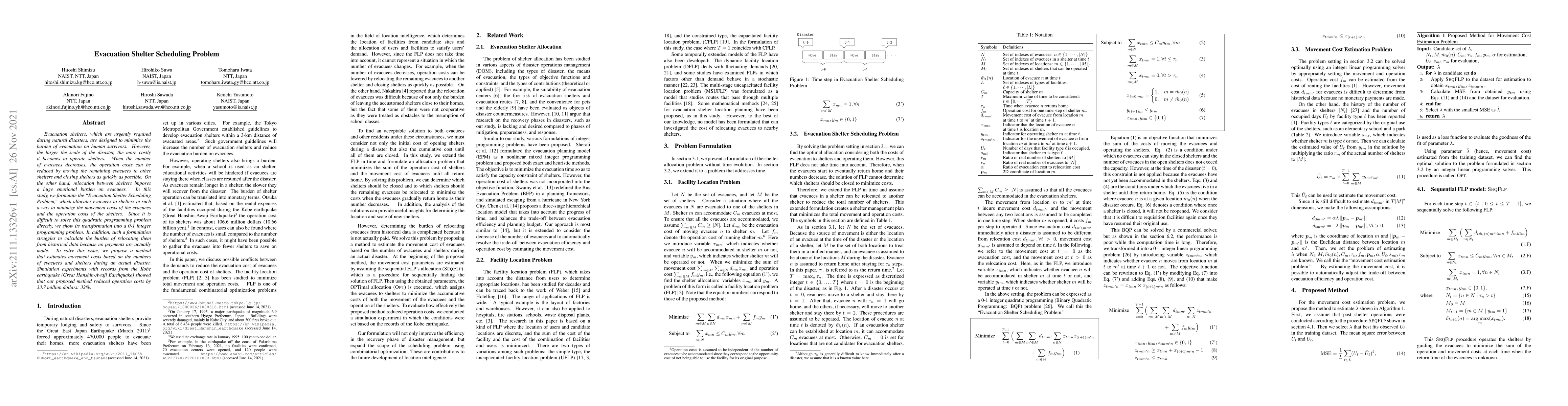 This research introduces the Evacuation Shelter Scheduling Problem, aiming to minimize both evacuee movement costs and shelter operation costs during disasters. By transforming a quadratic programming problem into a 0-1 integer programming problem, the study proposes a method to estimate movement costs using historical disaster data. Simulation experiments based on the Kobe earthquake records demonstrated a 32% reduction in operation costs.