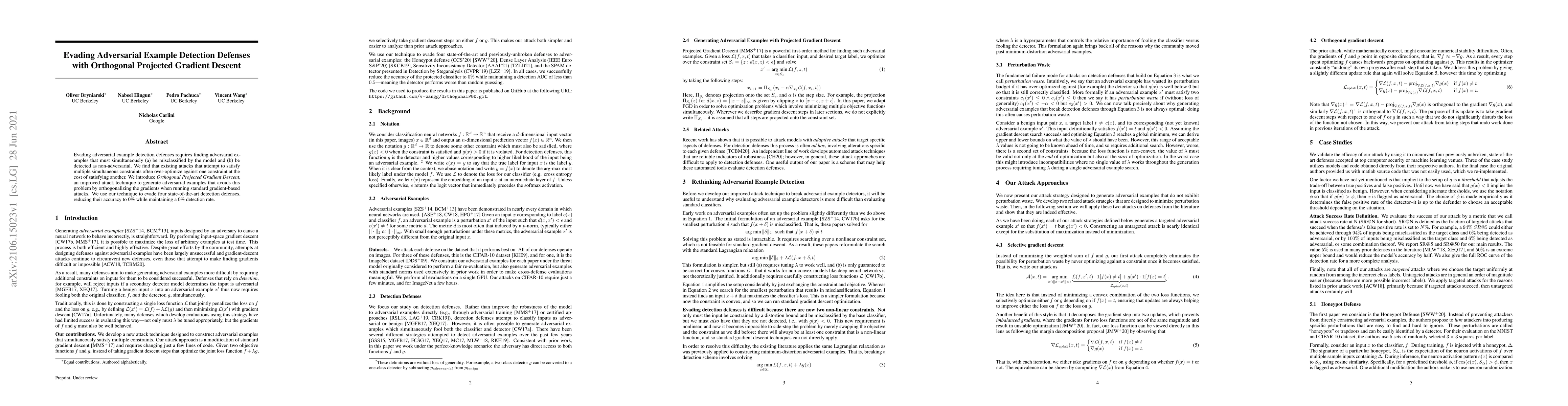 This paper introduces Orthogonal Projected Gradient Descent to generate adversarial examples that can evade detection defenses while being misclassified. The technique orthogonalizes gradients to balance attack constraints, successfully evading four state-of-the-art detection defenses with 0% detection rate.