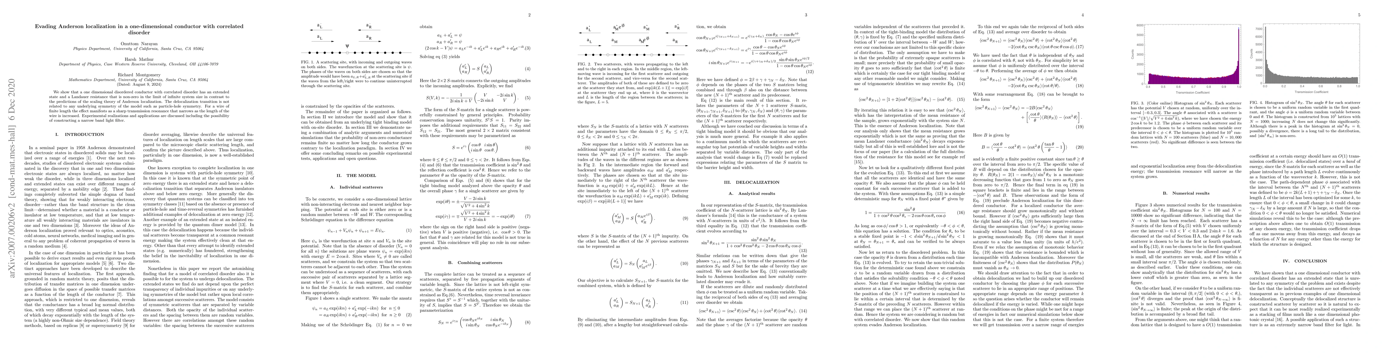 Summary: This paper demonstrates that a one-dimensional conductor with correlated disorder exhibits extended states and non-zero Landauer resistance, defying Anderson localization predictions. The delocalization is independent of particle-hole symmetry and results in sharp transmission resonances in finite wires, with potential applications like narrow band light filters.
