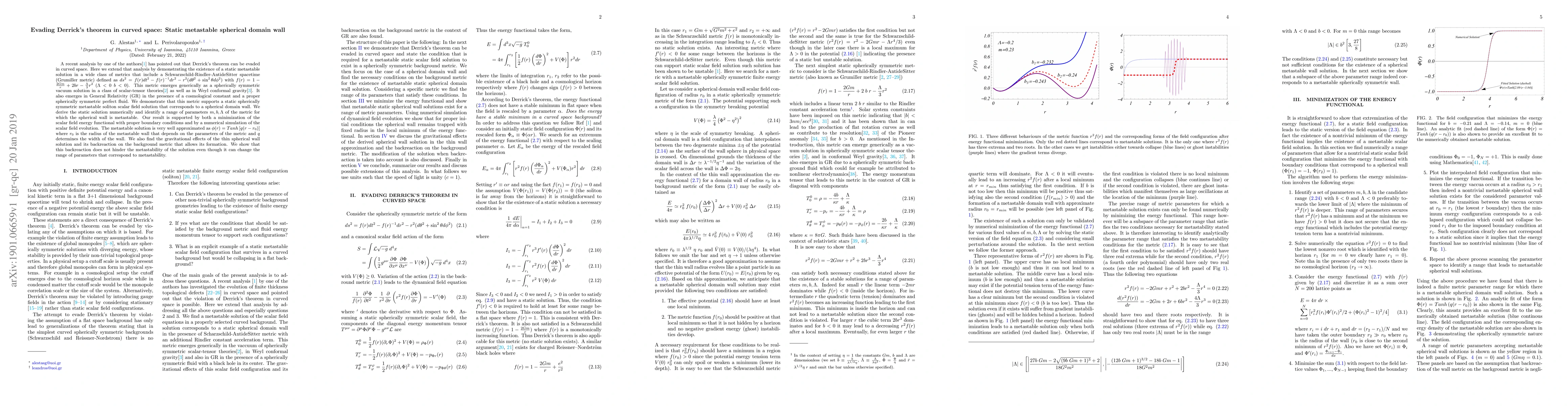 A recent analysis by one of the authors\cite{Perivolaropoulos:2018cgr} has pointed out that Derrick's theorem can be evaded in curved space. Here we extend that analysis by demonstrating the existence of a static metastable solution in a wide class of metrics that include a Schwarzschild-Rindler-AntideSitter spacetime (Grumiller metric) defined as $ds^2= f(r) dt^2 - f(r)^{-1} dr^2 - r^2 (d\theta^2 +\sin^2\theta d\phi^2)$ with $f(r)=1-\frac{2Gm}{r}+2br-\frac{\Lambda}{3} r^2$ ($\Lambda<0\; b<0$). This metric emerges generically as a spherically symmetric vacuum solution in a class of scalar-tensor theories\cite{Grumiller:2010bz} as well as in Weyl conformal gravity\cite{Mannheim:1988dj}. It also emerges in General Relativity (GR) in the presence of a cosmological constant and a proper spherically symmetric perfect fluid. We demonstrate that this metric supports a static spherically symmetric metastable soliton scalar field solution that corresponds to a spherical domain wall. We derive the static solution numerically and identify a range of parameters $m, b, \Lambda$ of the metric for which the spherical wall is metastable. Our result is supported by both a minimization of the scalar field energy functional with proper boundary conditions and by a numerical simulation of the scalar field evolution. The metastable solution is very well approximated as $\phi(r) = Tanh\left[q (r-r_0)\right]$ where $r_0$ is the radius of the metastable wall that depends on the parameters of the metric and $q$ determines the width of the wall. We also find the gravitational effects of the thin spherical wall solution and its backreaction on the background metric that allows its formation. We show that this backreaction does not hinder the metastability of the solution even though it can change the range of parameters that correspond to metastability.
