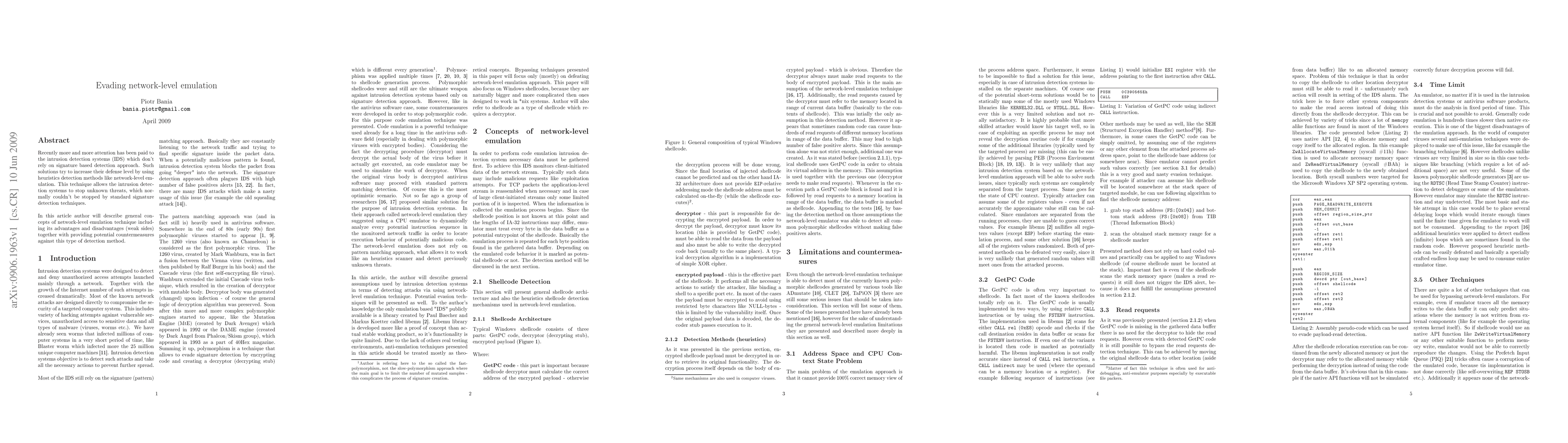 This paper discusses network-level emulation techniques used in intrusion detection systems to identify and stop unknown threats. It outlines the advantages and disadvantages of this method and proposes countermeasures to evade such detection.