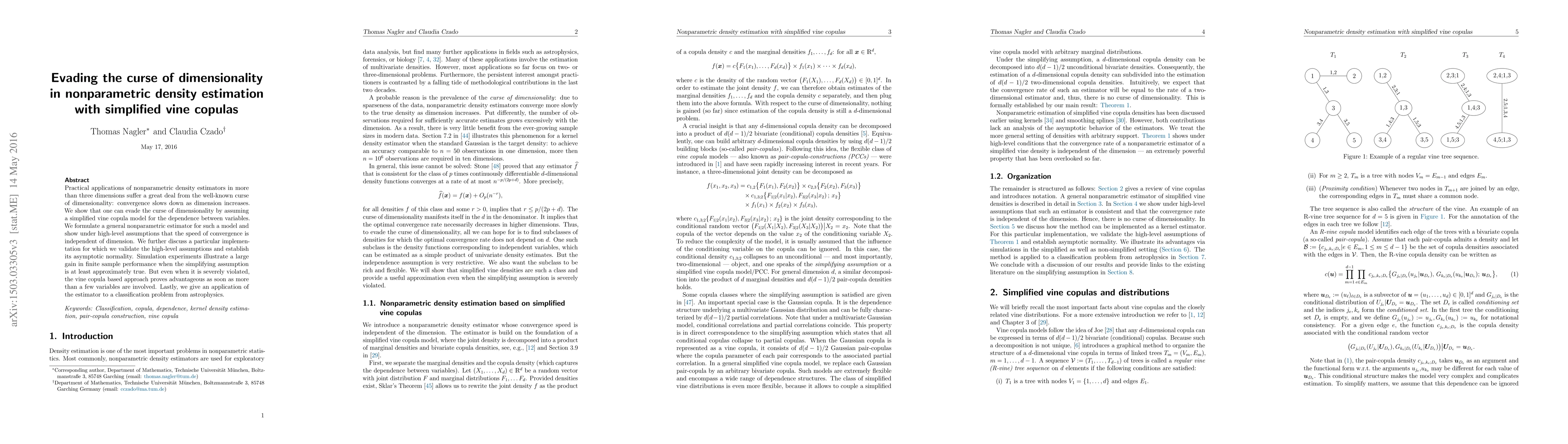 This paper proposes a nonparametric density estimator using simplified vine copulas to mitigate the curse of dimensionality in high-dimensional data. It demonstrates that under certain assumptions, the convergence speed is independent of the dimension, and validates the approach through simulation and an application to astrophysics classification.