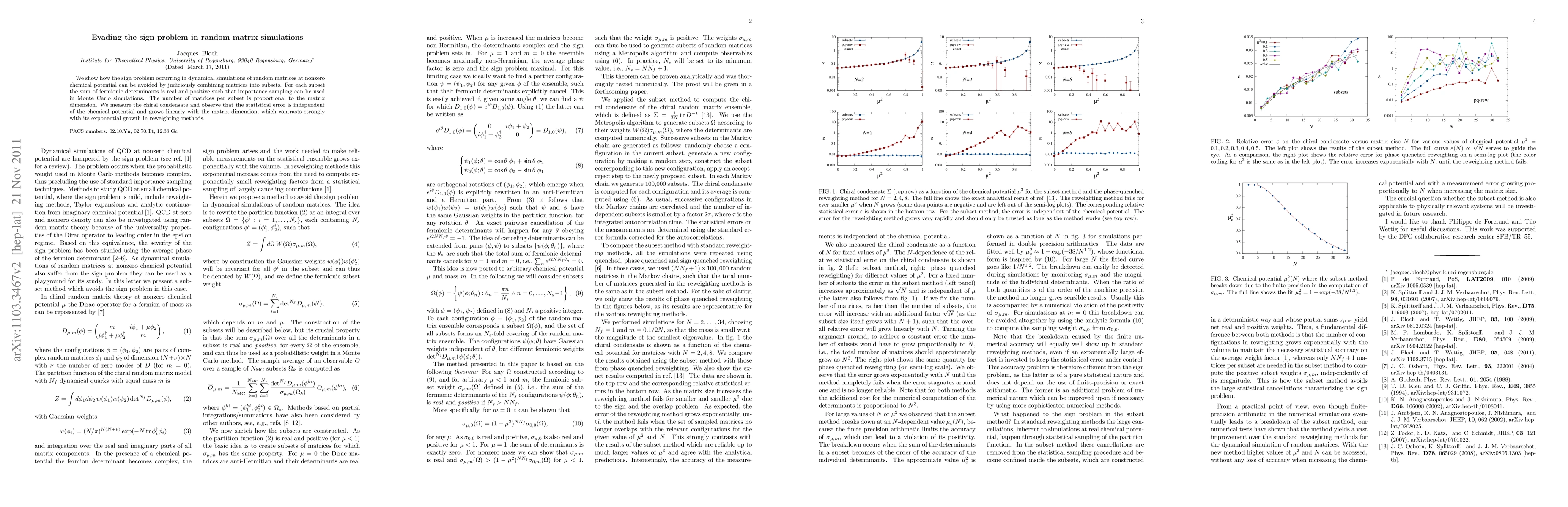 This paper presents a method to circumvent the sign problem in random matrix simulations at nonzero chemical potential by grouping matrices into subsets, ensuring real and positive sums of fermionic determinants, thus enabling effective Monte Carlo simulations. The statistical error in measuring the chiral condensate is shown to grow linearly with the matrix dimension, unlike the exponential growth seen in reweighting methods.