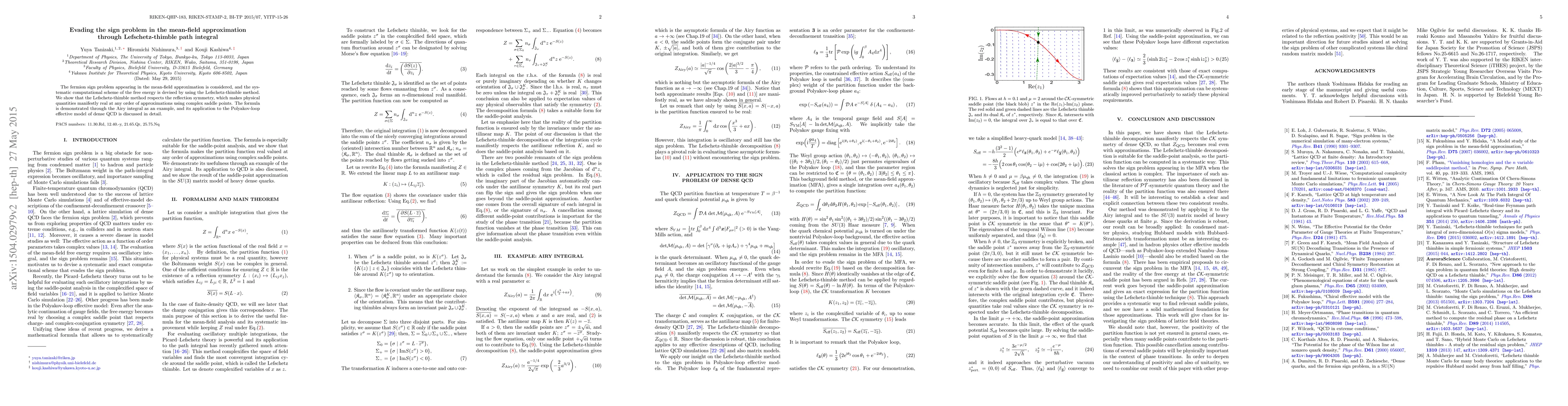 This paper proposes using the Lefschetz-thimble method to circumvent the fermion sign problem in mean-field approximations, ensuring that physical quantities remain real. The method is demonstrated via the Airy integral and applied to the Polyakov-loop effective model of dense QCD.