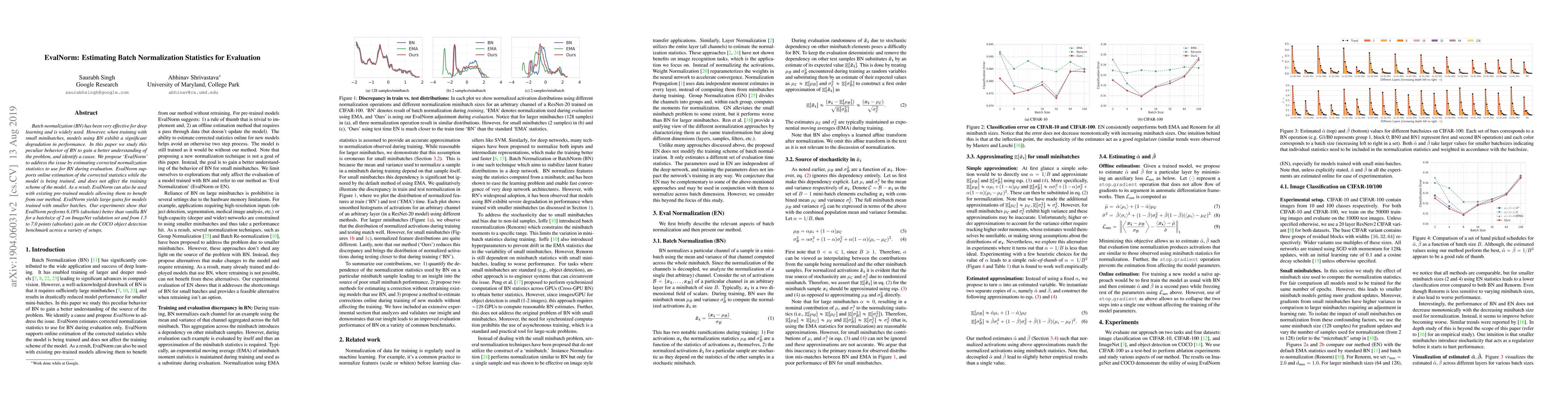 Batch normalization (BN) has been very effective for deep learning and is widely used. However, when training with small minibatches, models using BN exhibit a significant degradation in performance. In this paper we study this peculiar behavior of BN to gain a better understanding of the problem, and identify a cause. We propose 'EvalNorm' to address the issue by estimating corrected normalization statistics to use for BN during evaluation. EvalNorm supports online estimation of the corrected statistics while the model is being trained, and does not affect the training scheme of the model. As a result, EvalNorm can also be used with existing pre-trained models allowing them to benefit from our method. EvalNorm yields large gains for models trained with smaller batches. Our experiments show that EvalNorm performs 6.18% (absolute) better than vanilla BN for a batchsize of 2 on ImageNet validation set and from 1.5 to 7.0 points (absolute) gain on the COCO object detection benchmark across a variety of setups.