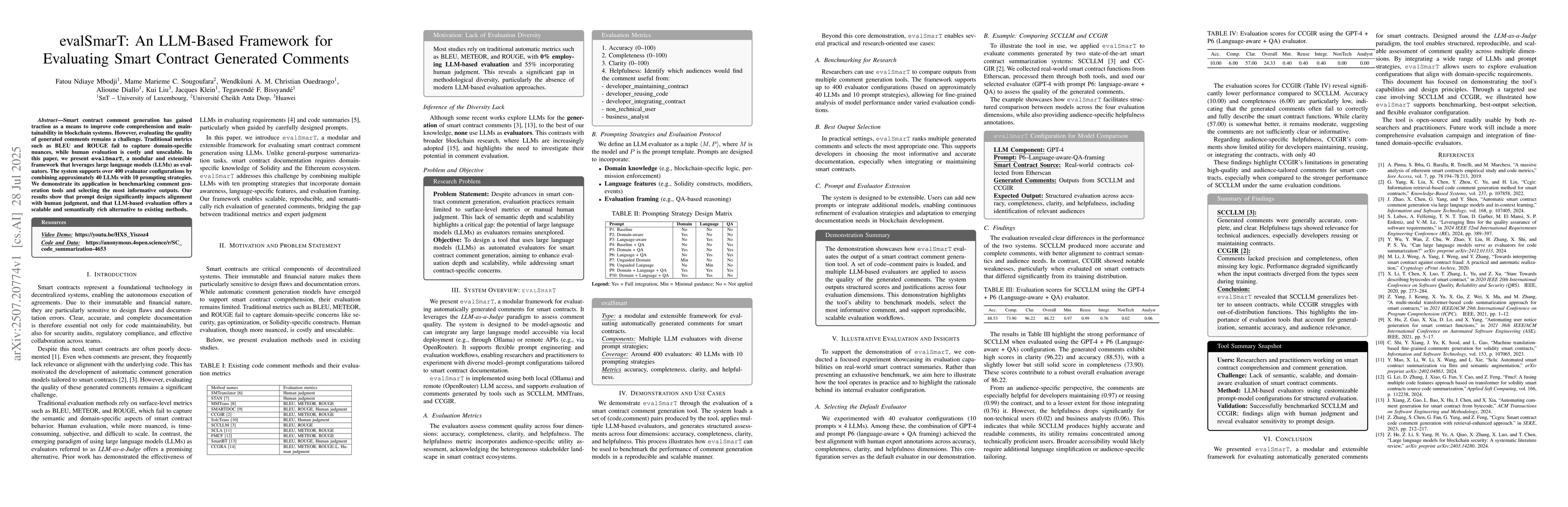 Smart contract comment generation has gained traction as a means to improve code comprehension and maintainability in blockchain systems. However, evaluating the quality of generated comments remains a challenge. Traditional metrics such as BLEU and ROUGE fail to capture domain-specific nuances, while human evaluation is costly and unscalable. In this paper, we present \texttt{evalSmarT}, a modular and extensible framework that leverages large language models (LLMs) as evaluators. The system supports over 400 evaluator configurations by combining approximately 40 LLMs with 10 prompting strategies. We demonstrate its application in benchmarking comment generation tools and selecting the most informative outputs. Our results show that prompt design significantly impacts alignment with human judgment, and that LLM-based evaluation offers a scalable and semantically rich alternative to existing methods.