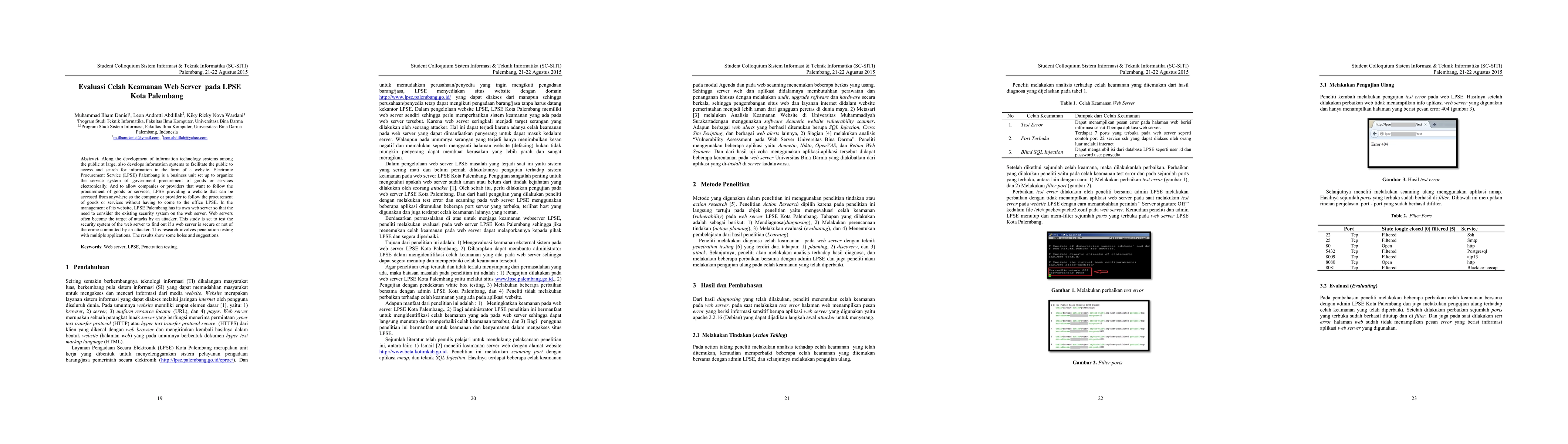 Along the development of information technology systems among the public at large, also develops information systems to facilitate the public to access and search for information in the form of a website. Electronic Procurement Service (LPSE) Palembang is a business unit set up to organize the service system of government procurement of goods or services electronically. And to allow companies or providers that want to follow the procurement of goods or services, LPSE providing a website that can be accessed from anywhere so the company or provider to follow the procurement of goods or services without having to come to the office LPSE. In the management of its website, LPSE Palembang has its own web server so that the need to consider the existing security system on the web server. Web servers often become the target of attacks by an attacker. This study is set to test the security system of the web server to find out if a web server is secure or not of the crime committed by an attacker. This research involves penetration testing with multiple applications. The results show some holes and suggestions.