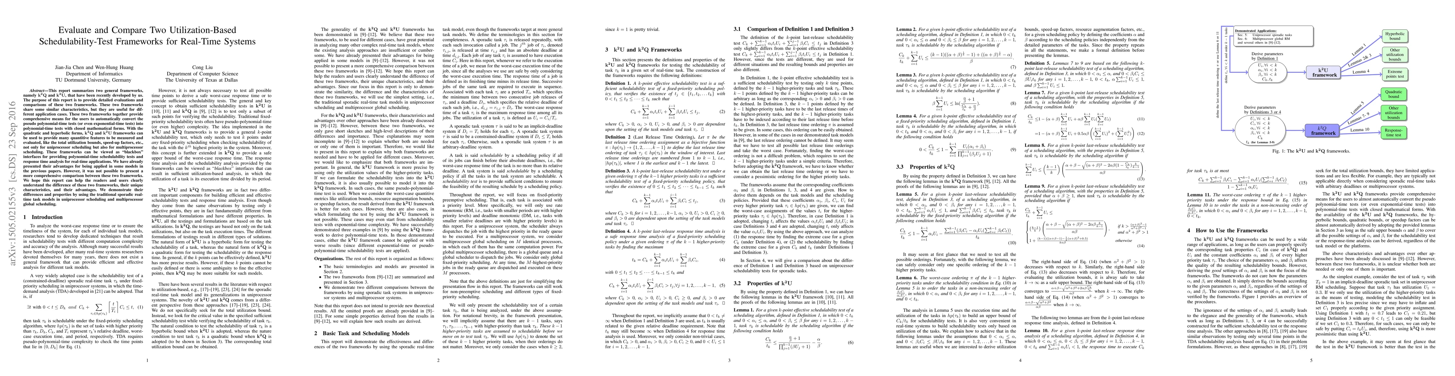 This paper evaluates and compares two utilization-based schedulability-test frameworks, k2Q and k2U, developed for real-time systems. It highlights their unique characteristics, advantages, and applications in uniprocessor and multiprocessor scheduling.